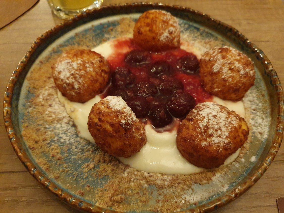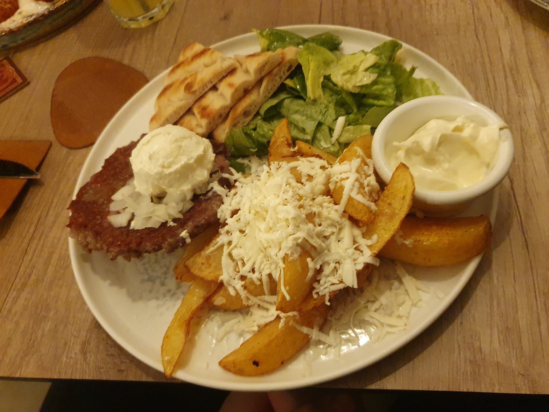 A pacalleves jó ízű, a pacalcsíkok puhák. Tisztes, házias, csavarmentes fogás. A közel 4000 forintos árhoz képest kisméretű pljeszkavica belül szép rosé, amit értékelünk, a sült burgonya nem mirelit, viszont nem is üti igazán a mércét, jót tesz neki, hogy érlelt juh-telemea-t reszeltek rá. A saláta lélektelen, lehetne rajta javítani, a készen vett görög pita nem élvezhetetlen, a kajmak finom. Összességében a tányér jobbacskának mondható. A túrófánk élvezhető, itt ellentétben a leggyakoribb megoldással, apró gömböket formáztak a tésztából és nem áfonyadzsemmel adták fel, hanem meggyel, s persze édesített tejfellel, mint általában. Korrekt produkció.
