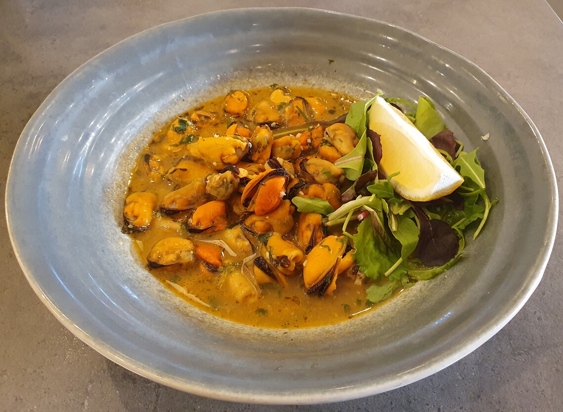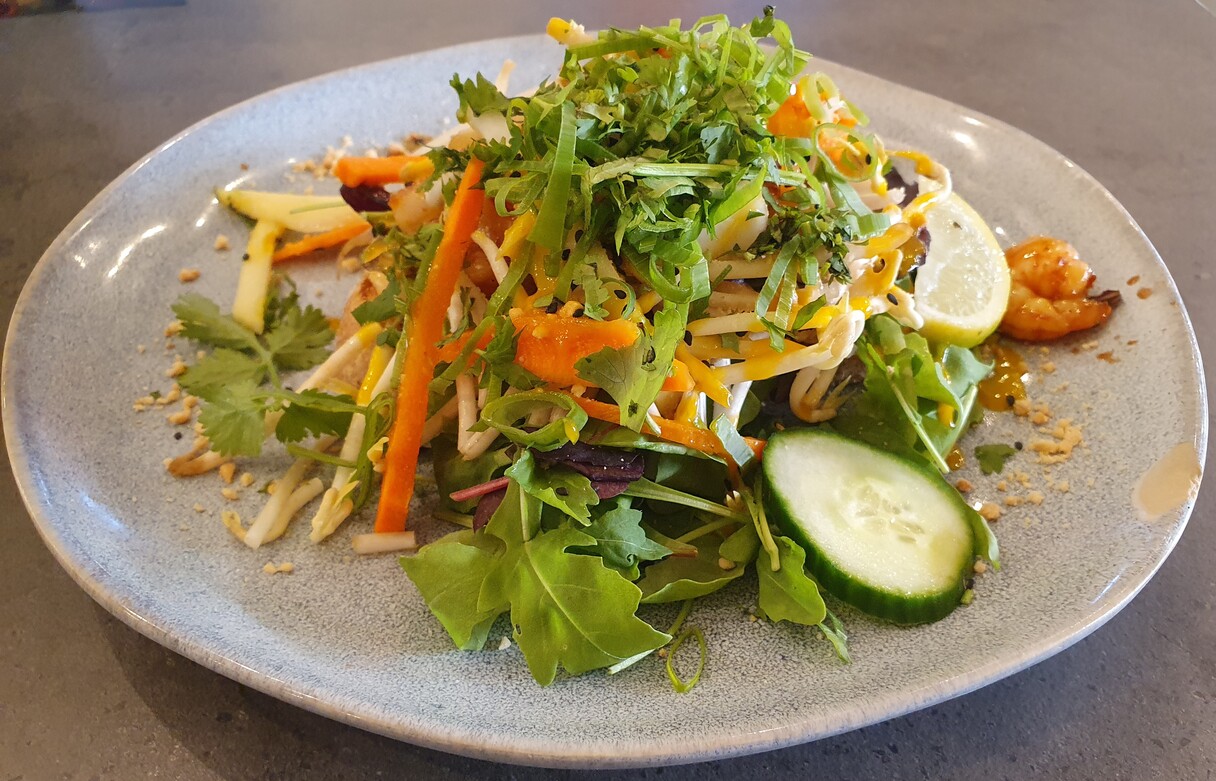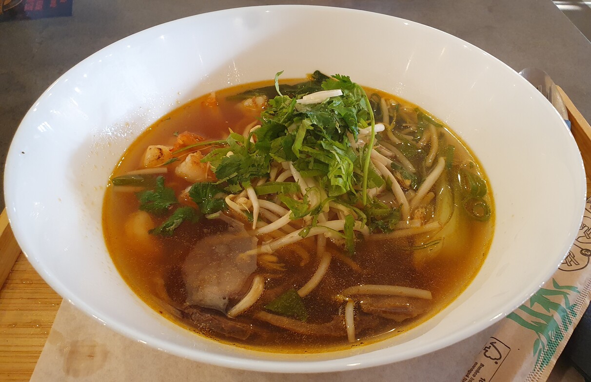 A pho leves ízletes, harmonikus, külön kiemelendő a jó állagú, jó ízű marhahús, mely meghaladja a legtöbb pho-bár produkciójának szintjét. Dilemmáztunk, hogy fehérboros kagylót kérjünk-e vagy rizstészta-gombócot garnélával töltve, mangós ponzuval, a tulajdonos a kagylót javasolta, azt is vállalva, hogy ha nem az elvárt ízvilágot kapjuk, akkor vendégei vagyunk bármelyik fogásról is legyen szó. Nem éltünk a rendkívül gáláns ajánlattal, de tény, hogy héjas kagylóra számítottunk. A lé sótlan volt, még az átlagnál kevesebb sót használó asztaltársam szerint is. Összességében nem volt ez rossz produkció, de nem érte el a másik két fogás színvonalát. A sótlanságot lehetett orvosolni, ellentétben a fősodratú helyeken sokkal jellemzőbb elsózottsággal. A salátamixszel, savanyított zöldségekkel, babcsírával, pack choi-jal, mangós dresszinggel, mogyoróval és kellő mennyiségű zöld korianderrel készült garnélás „umami szendvics” meggyőző volt, ízletes és szépen tálalt.