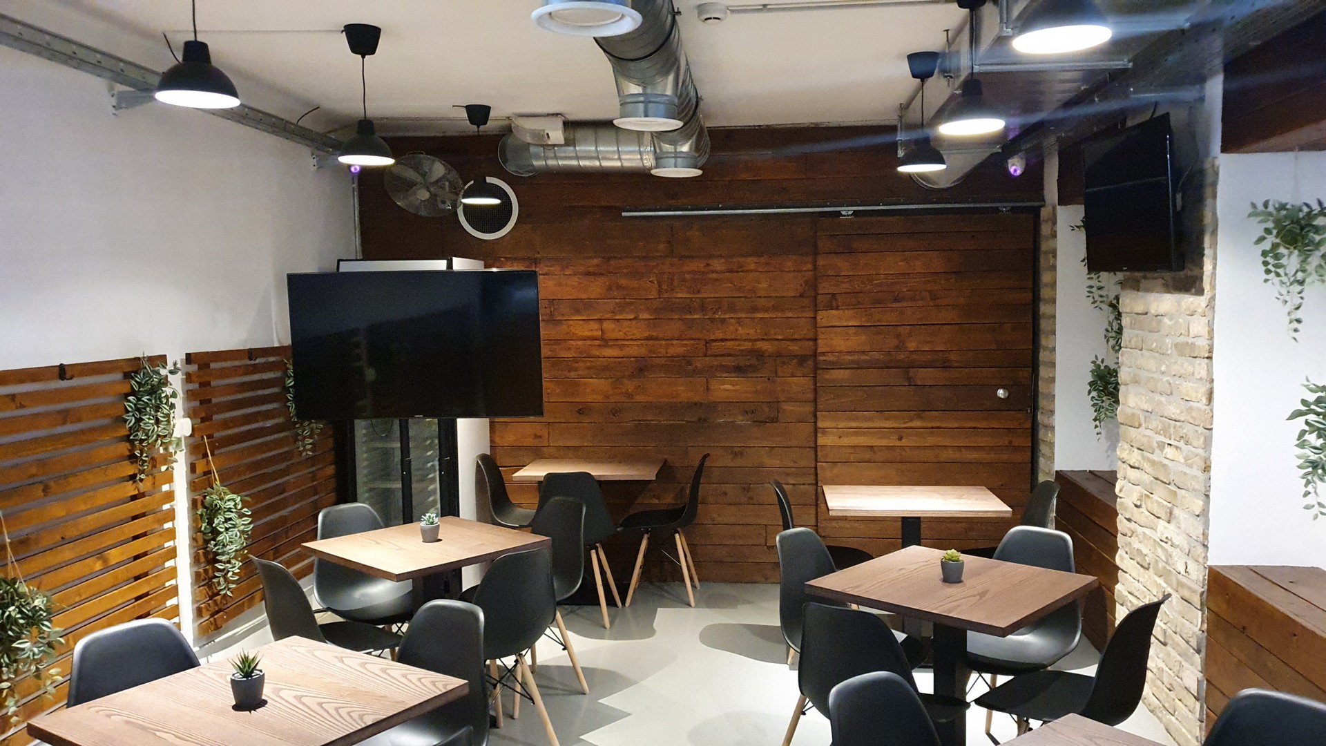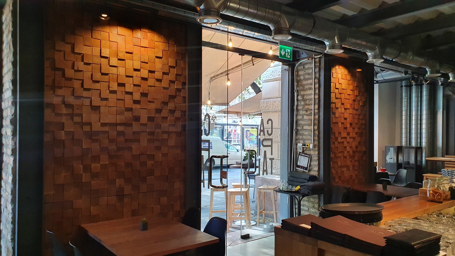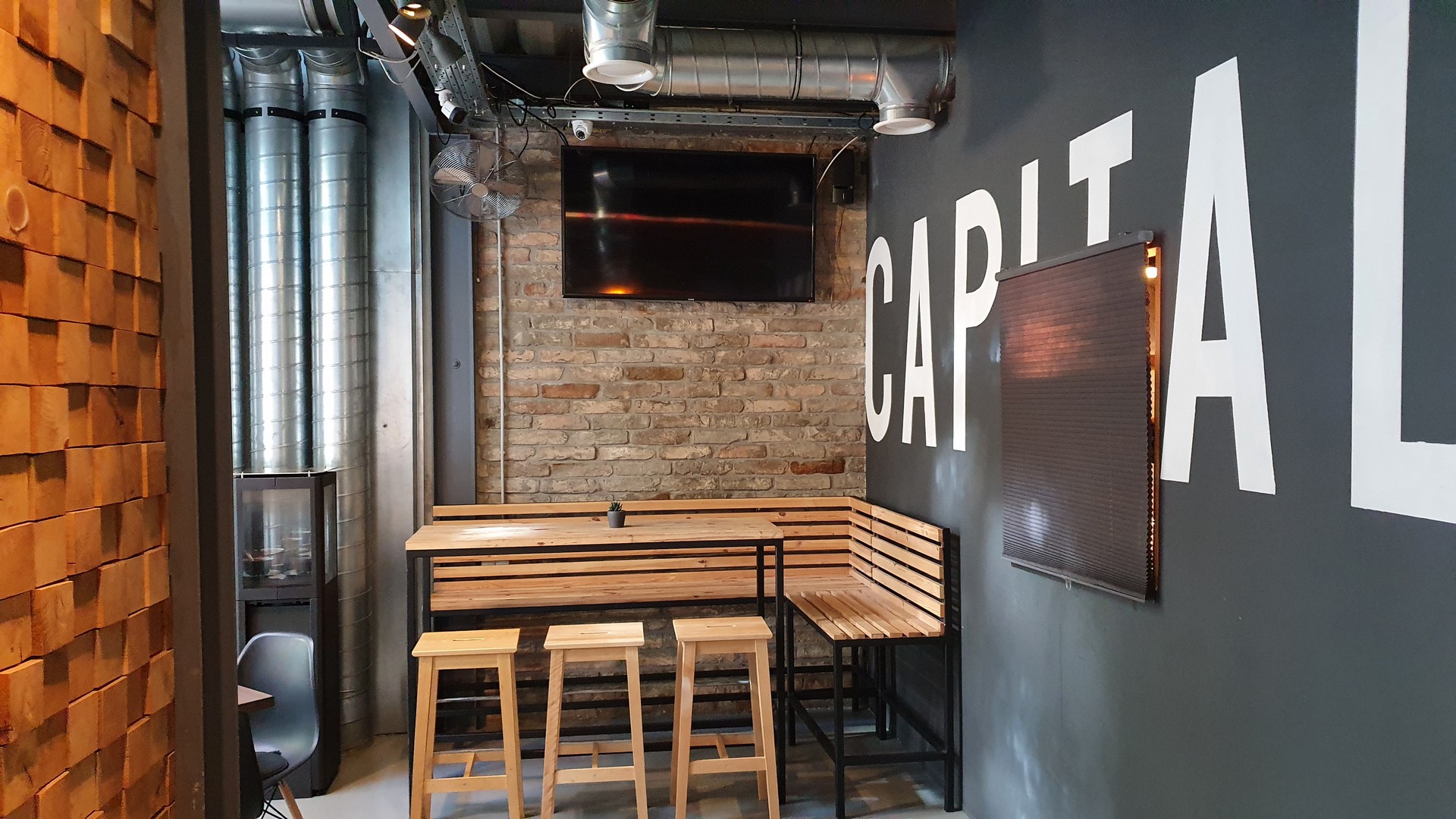 Egy éttermek bemutatására szakosodott vizuális alkotóműhely első saját helye. A berendezés puritán, hoz valamit az ipari dizájnból és a körúti kocsmák egyszerűségéből. Nyáron teraszt is üzemeltetnek az utcán. Az asztalon étkezdébe illő ipari borsliszt- és sószóró.