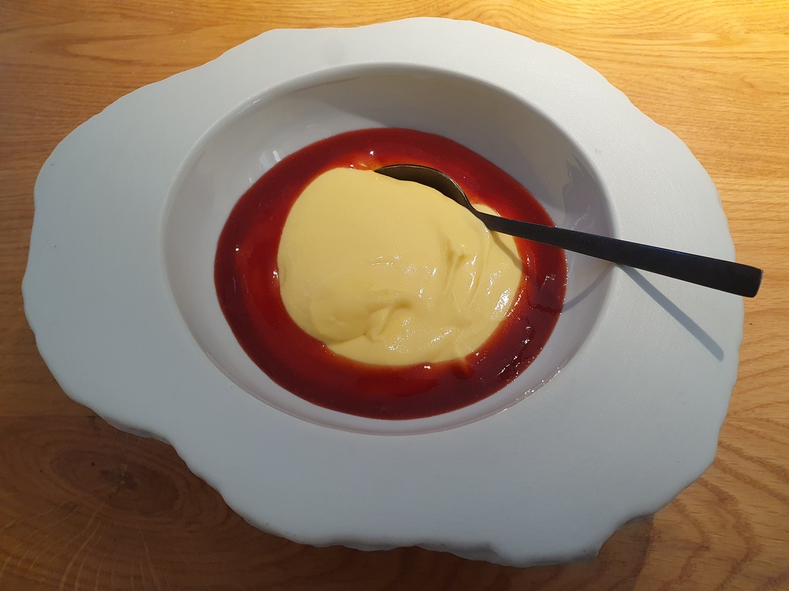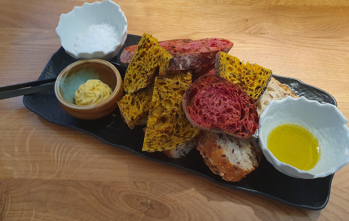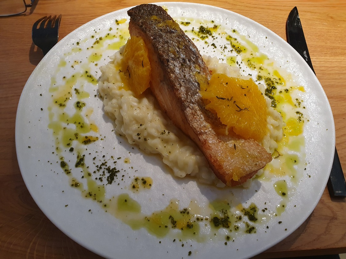 Előételnek kenyérválogatást rendeltem, amiben, ha nem is tökéletesen friss, de kimagasló minőségű kurkumás, céklás és „sima” kovászos kenyér kapott helyet, fűszervaj, jó minőségű olívaolaj és Maldon só kíséretében. Jó indítás. Második fogásom aranydurbincs lett volna, de lazacot kaptam. A félreértés forrása máig rejtély számomra. A hűtőízmentes citrusmártásos, narancsszeletekkel felszolgált lazac nem volt élvezhetetlen, de kissé kiszáradt, szaftosabbat vártam. A rizottó korrekt. Az epermártással kínált ordás sárgadinnye-mousse élvezetesnek bizonyult, bár hiányzott még valami kísérőelem, befejezetlenség-érzést keltett.