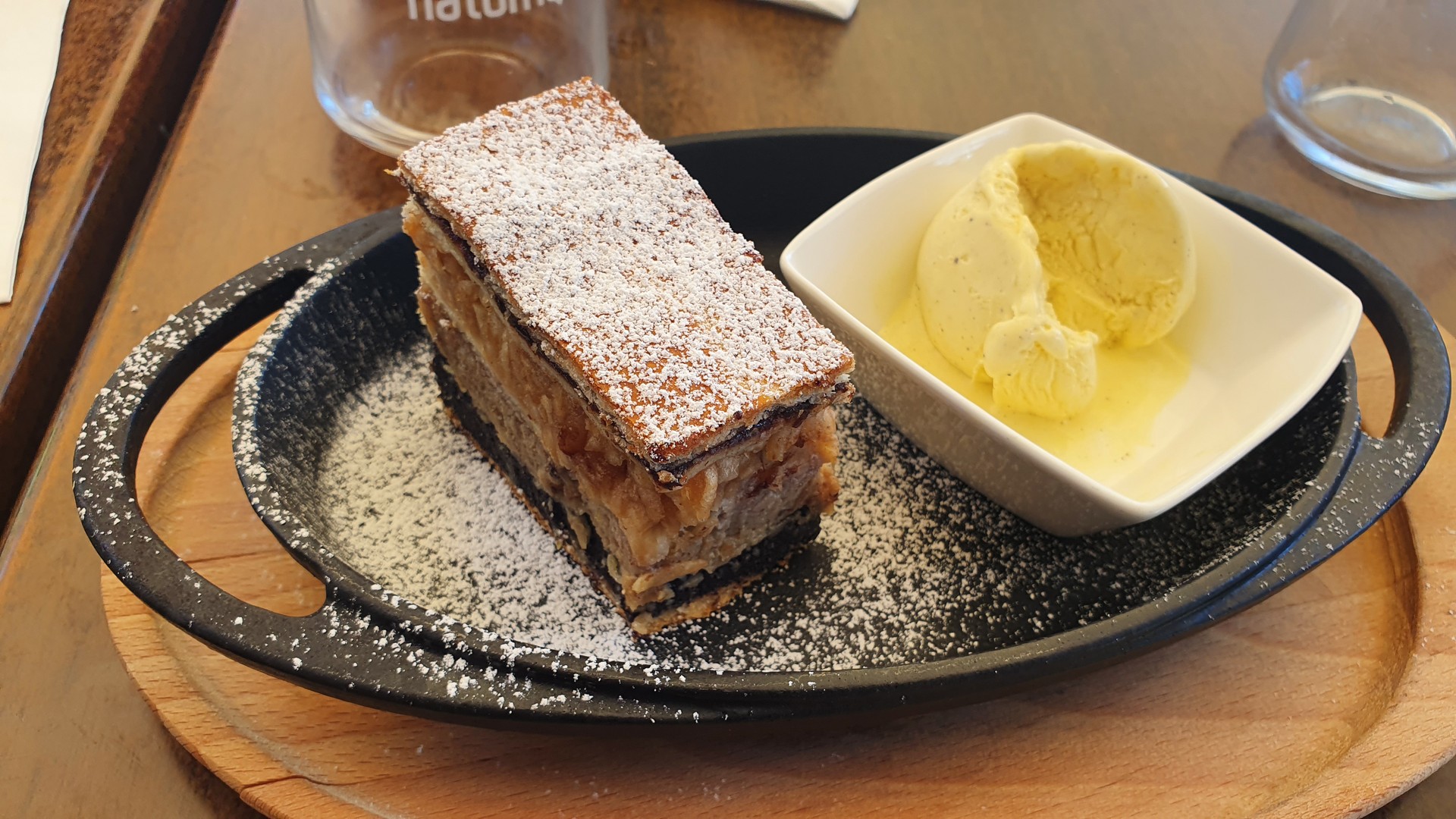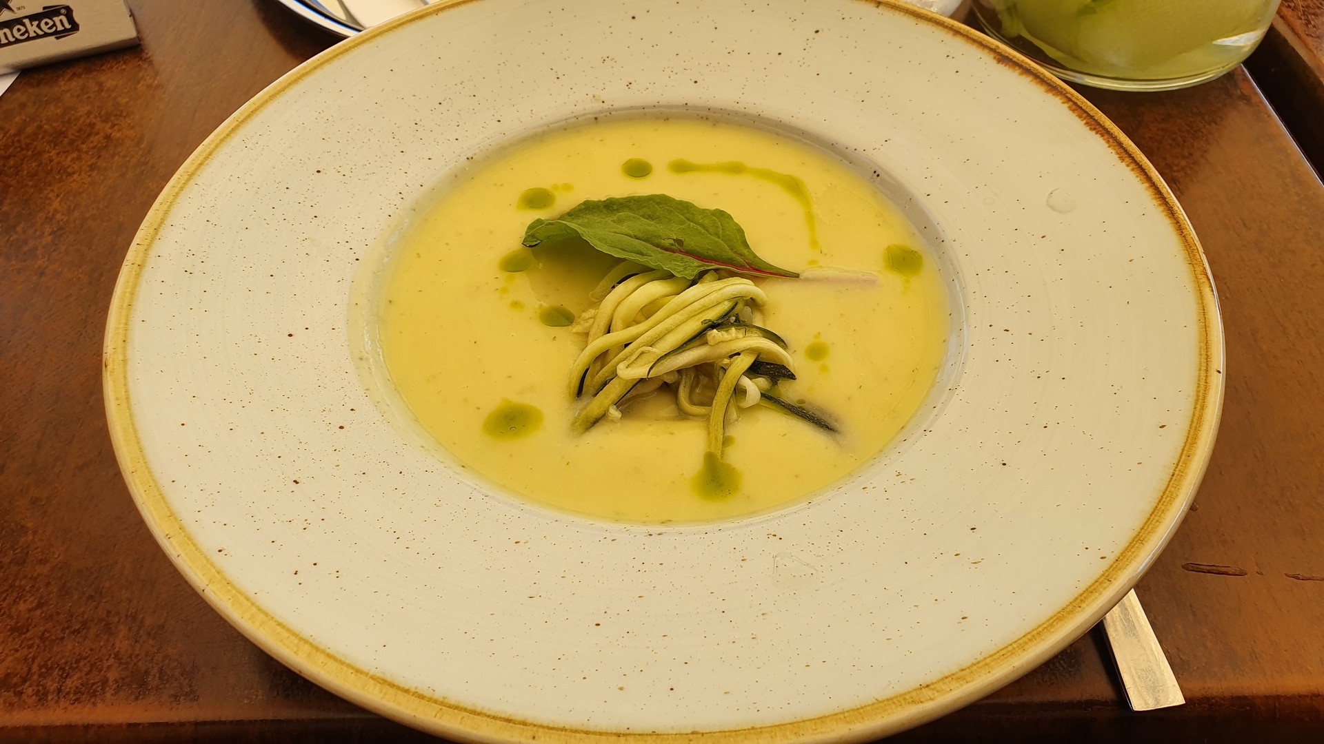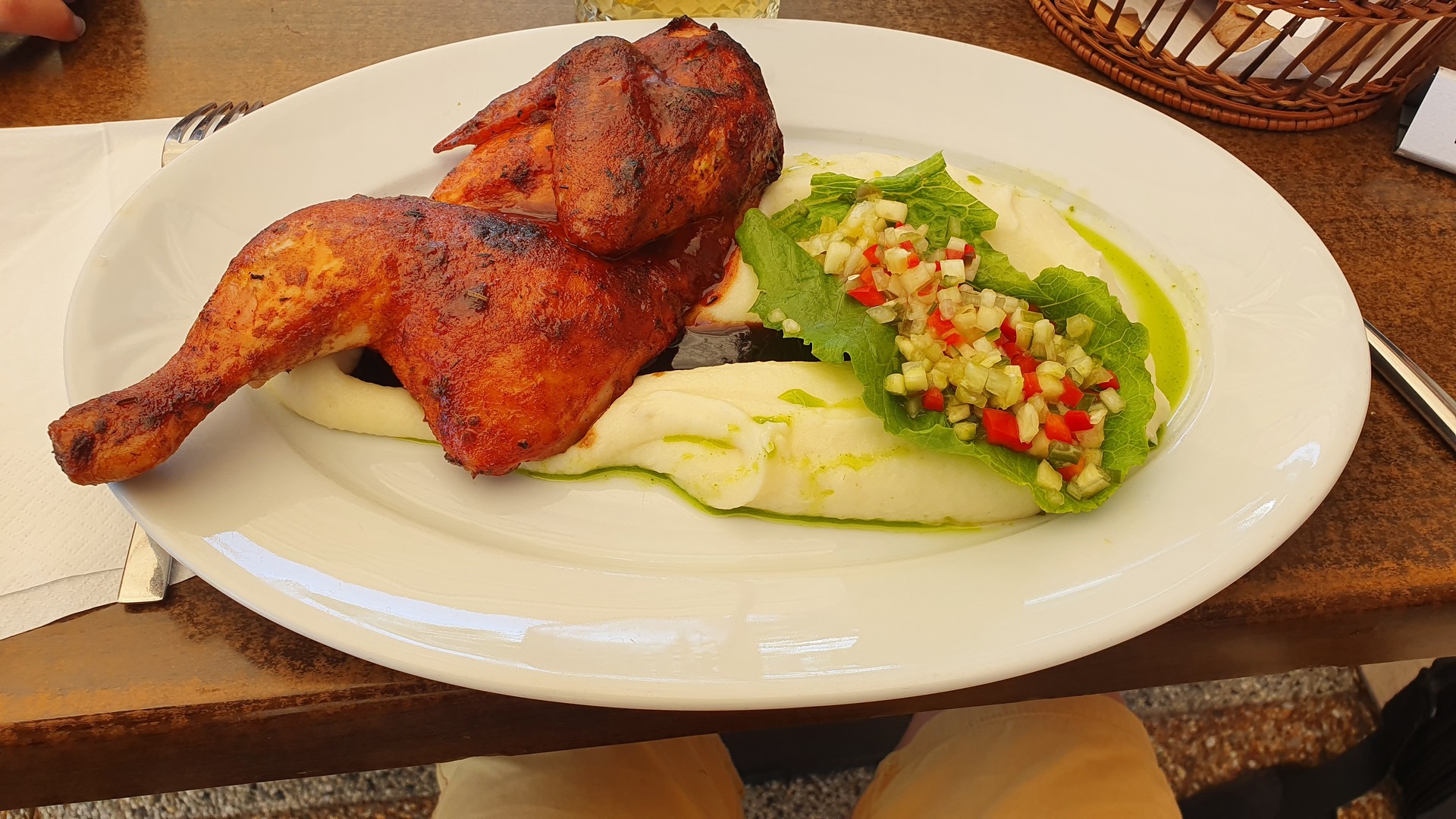 A lazac carpaccio tálalása egyedi volt, ízre, állagra is kiváló, a műfaj remeke. A vékony lazacszeletek négyzetalakban, mint összefüggő egység borították be a tányért, ezt szórták meg vegyes salátalevelekkel, valamint félbevágott, színes koktélparadicsommal, s locsolták meg zöldfűszeres olajjal. Különleges izgalmat hozott a tökleves üdesége és kellemesen selymes állaga is. Finom volt a remek burgonyapürével, és ananászsalsaval kínált BBQ grillcsirke. A vanília-fagylalttal, ovális vasserpenyőben tálalt flódni hozta a megszokott ízharmóniákat, egy fokkal könnyedebben és állagra megnyerőbben, mint a legtöbb helyen.