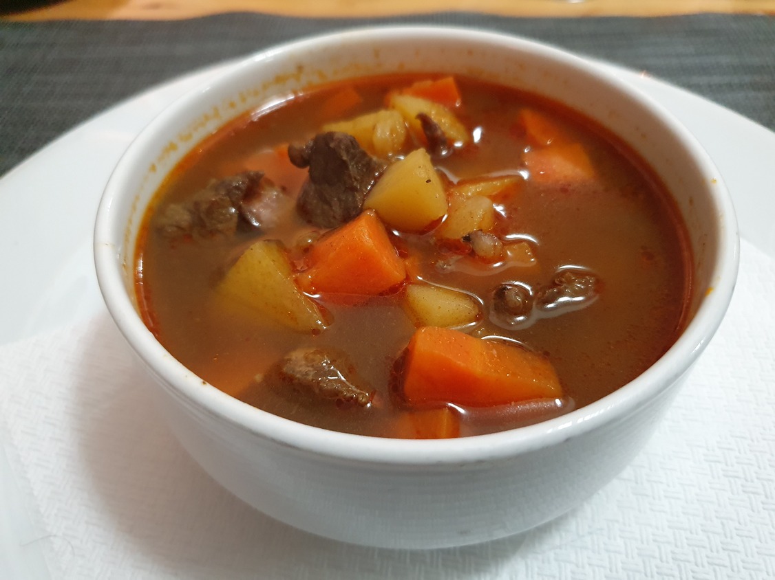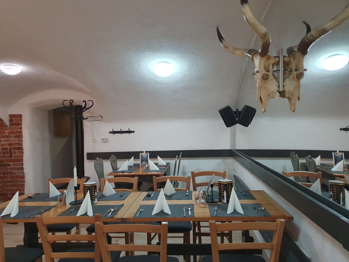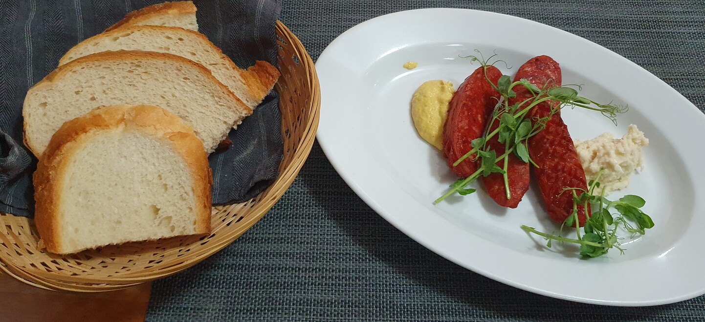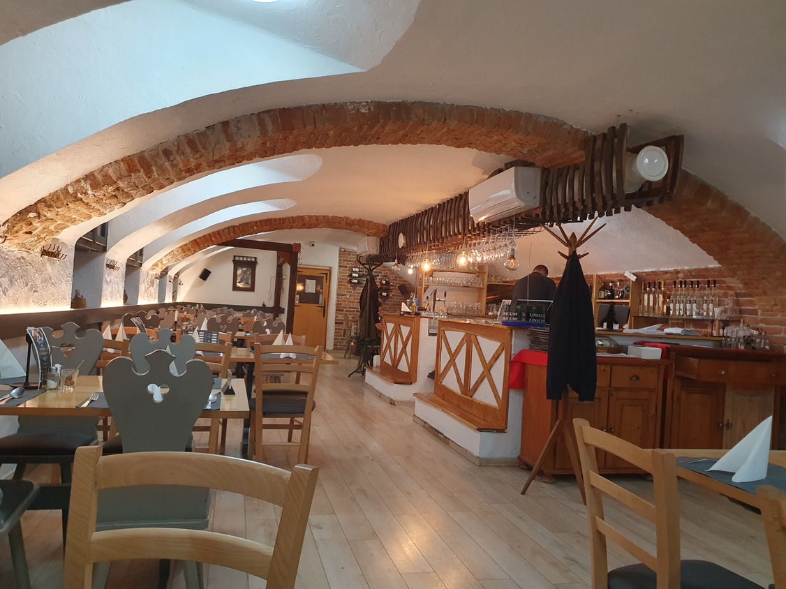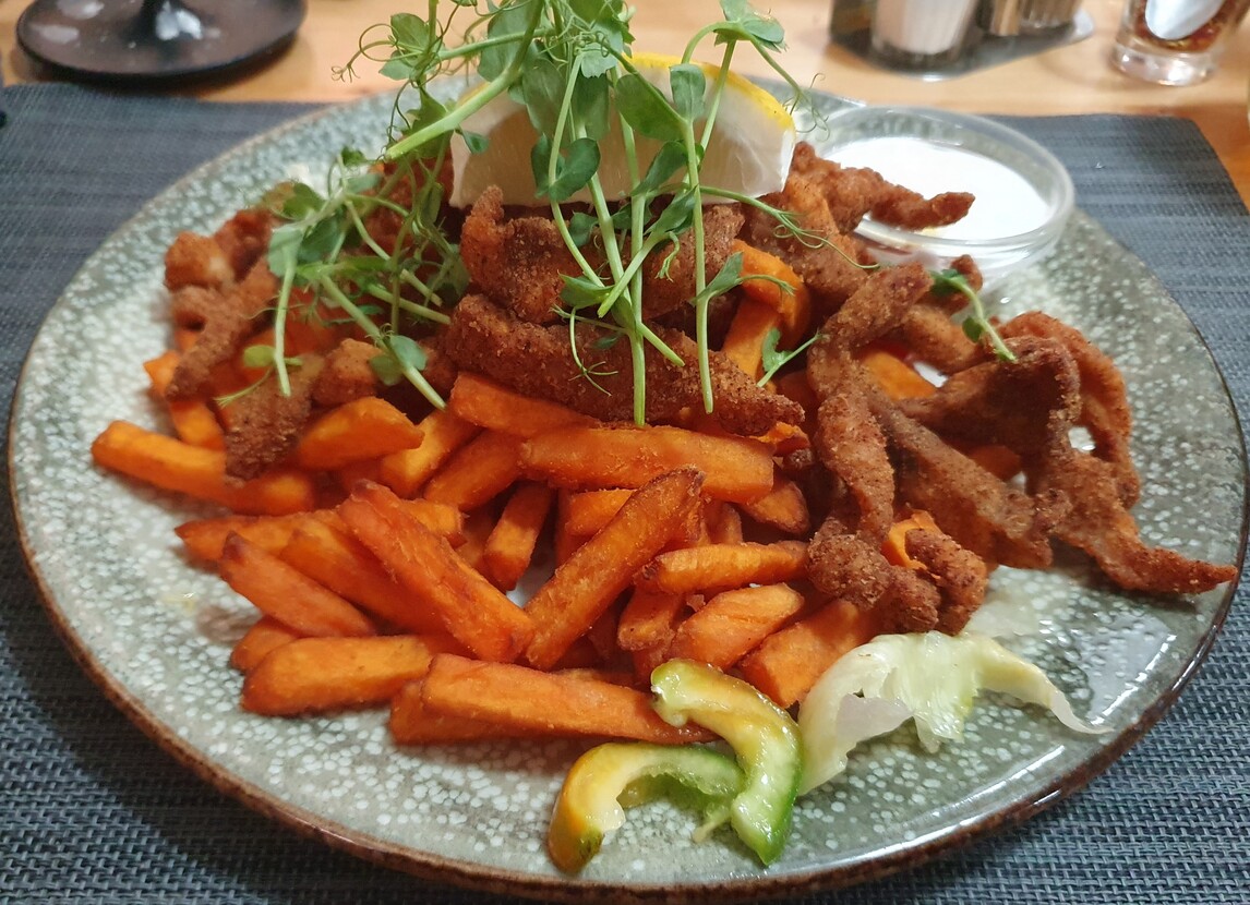 A napi ajánlatot – haltepertő, halászlé – a bejáratnál elhelyezett fekete táblára fehér krétával írták fel. Meg is rendeltük volna mindkettőt, de mint kiderült, mindkettő elfogyott, csak még nem törölték le. Kompenzálta a frusztrációt valamennyire, hogy van harcsachips az étlapon, igaz más árfekvésben. Meg is rendeltük. Várakozásainknak megfelelően lényegében haltepertőt, kaptunk kifejezetten jól elkészítve afrikai harcsából. Adtak hozzá egy kis salátát, nem kellően karakteres fokhagymás tejfelt és megfelelően megsütött mirelit édesburgonyát. Kértünk gulyáslevest is, mely enyhén sótlan volt, de ezen tudtunk segíteni, amúgy jól sikerült, színe éppenséggel lehetett volna pirosabb. Értékeltük, hogy a hús, a burgonya és a zöldségek nem főttek túl, a betétként adott apró grízgaluskák is rendben voltak. A debreceni páros élvezhető, nem kiugró, mellé gyári, erejét vesztett tormát és átlagos mustárt adnak. A kenyér egyszerű minőségű, értékeljük, hogy a felszolgáló jelzi, hogy kovászos kenyérrel szokták adni, de ezúttal nem sikerült beszerezni. A somlói galuska szaftos, a tejszínhab valódi, a dió hiányzik belőle, a csokimártás lehetne koncentráltabb, karakteresebb. Ezzel együtt ezt is jobbacskának mondanám, akárcsak a gulyást.