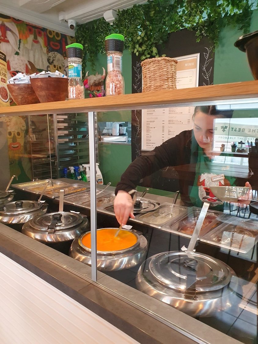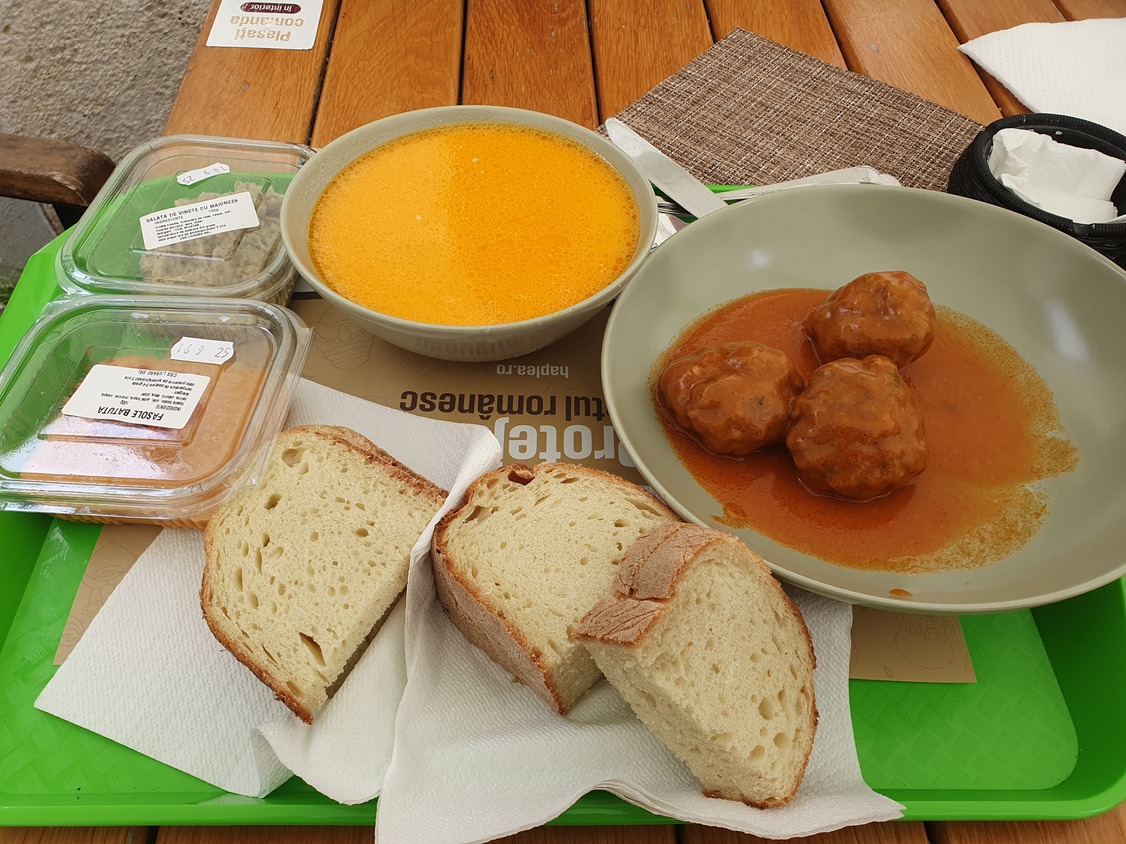 Az előételeket kis adagokban műanyag dobozkába csomagolják, így adják a vendégnek akár helyben fogyasztja, akár elviszi. Az árak a mennyiséghez mérten kedvezőek. A padlizsánkrém igényel némi sózást, egyébként ízre, állagra egyaránt meggyőző, akárcsak a sütve-párolt fűszeres-hagymás tört bab. Jobbacska kenyeret adnak hozzá. A pacalleves kifejezetten jól sikerült, a lé selymes, jóízű, miként a puha pacal is, aminek mennyisége megfelelő. A paradicsommártásos húsgombócok korrektek, menzaszerűek, de nincs ebben nagy meglepetés, elvégre egy dizájnosabb menzán vagyunk. A fogás hőmérséklete lehetne magasabb.