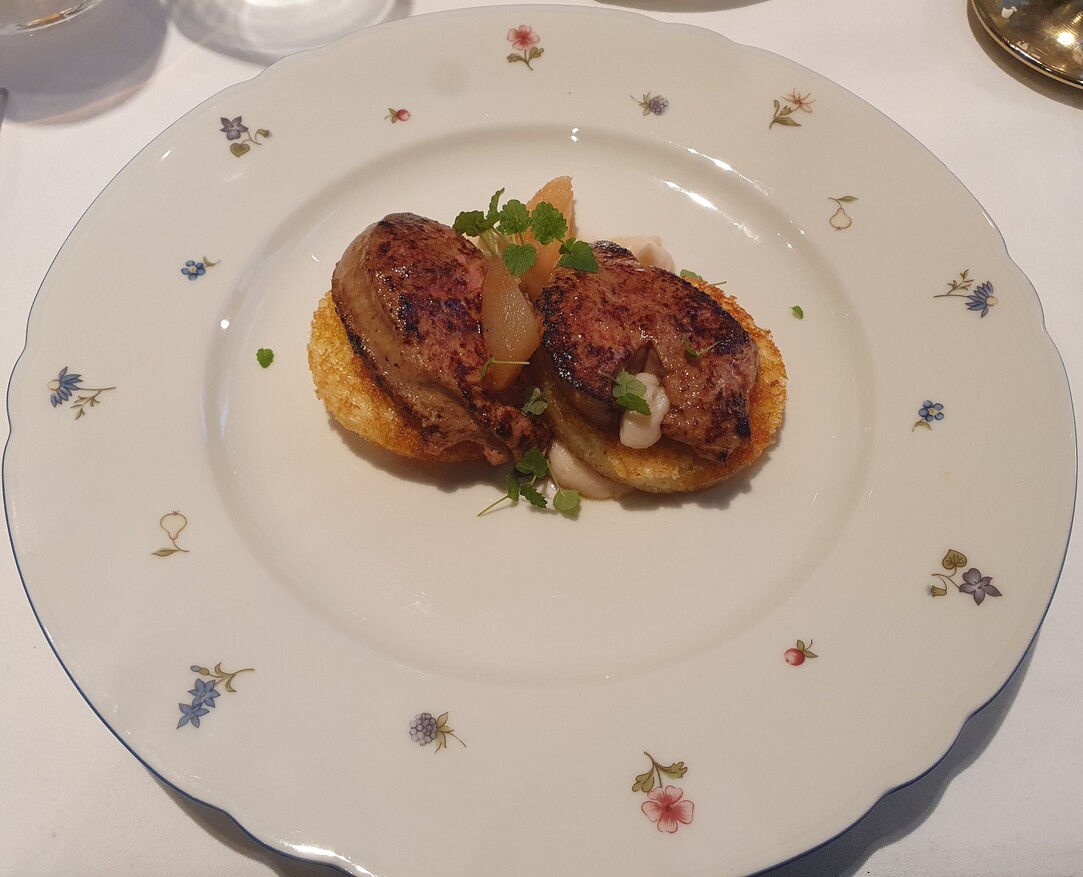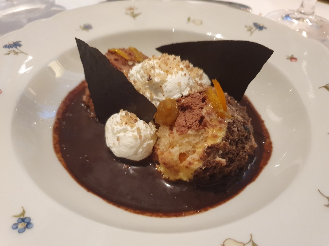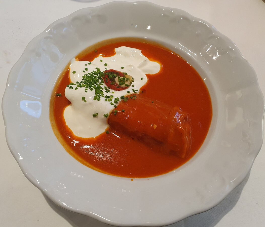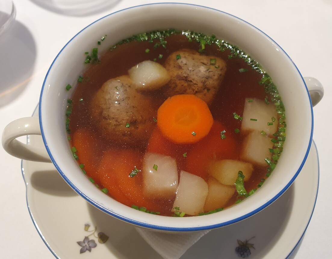 A marhahúsleves kérhető májgombóccal vagy fridattóval, zöldségekkel és marhahússal. Jómagam az előbbire szavaztam. A lé mély színű és mély ízű, a zöldség nincs túlfőve, a gombóc jó tartású és ízletes. Házias, csavarmentes fogás tökélyre fejlesztve. Meglepő, hogy az asztalon nincs borsdaráló csak borslisztszóró, kérésre hoznak darálót is. A körtével és kalácskoronggal felszolgált libamájnak nincs tartása, belseje szinte folyik. A körte nem tűnik elégséges kísérőelemnek. Nem élvezhetetlen a fogás, de csalódást okoz, jobbakhoz szoktunk, még egyszerűbb helyeken is. A hortobágyi palacsinta nem nagy adag, ezt elismerésnek szánom, bőven elég egy palacsinta, nem cél a jóllakás az előétellel. Jó szívvel adagolt, megnyerő állagú, ízletes mártásban szolgálják fel. A műfaj kiemelkedő darabja. A bőséges mártás miatt kenyeret is kérek hozzá, ami kovászos, friss, csúcsminőségű és nem kerül a számlára. A túrógombóc belül kicsit krémes, puha, nem a klasszikus remegős, ami vélhetően szándékolt. Ízre remek, akárcsak a fahéjas édes tejfel. Egy nem túl méretes gombóc az adag, nekem pont elég volt. A somlói volt az étkezésünk csúcspontja, szaftos, harmonikus, van benne roppanós elem is, magas minőségű alapanyagokból készült. Telitalálat.