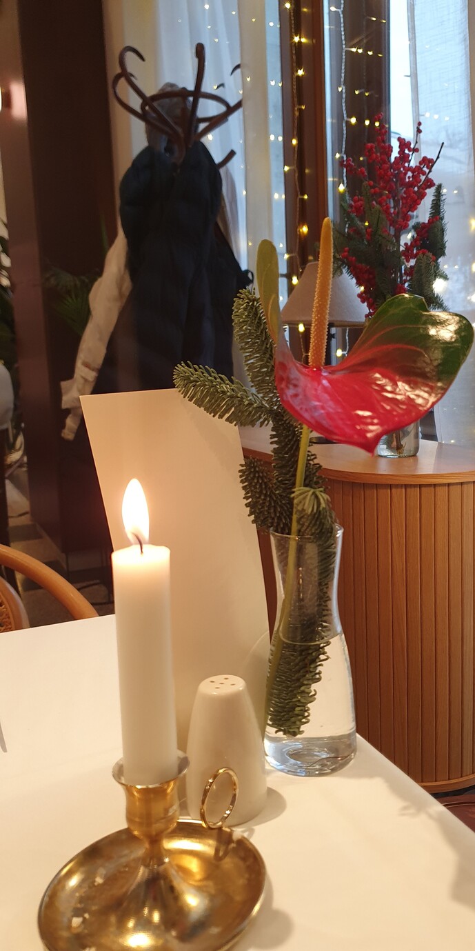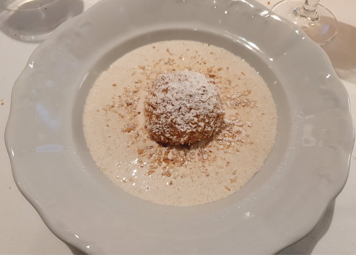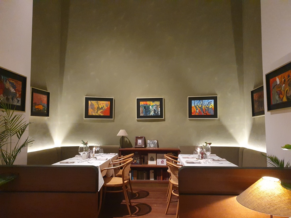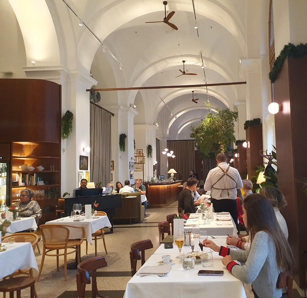 A marhahúsleves kérhető májgombóccal vagy fridattóval, zöldségekkel és marhahússal. Jómagam az előbbire szavaztam. A lé mély színű és mély ízű, a zöldség nincs túlfőve, a gombóc jó tartású és ízletes. Házias, csavarmentes fogás tökélyre fejlesztve. Meglepő, hogy az asztalon nincs borsdaráló csak borslisztszóró, kérésre hoznak darálót is. A körtével és kalácskoronggal felszolgált libamájnak nincs tartása, belseje szinte folyik. A körte nem tűnik elégséges kísérőelemnek. Nem élvezhetetlen a fogás, de csalódást okoz, jobbakhoz szoktunk, még egyszerűbb helyeken is. A hortobágyi palacsinta nem nagy adag, ezt elismerésnek szánom, bőven elég egy palacsinta, nem cél a jóllakás az előétellel. Jó szívvel adagolt, megnyerő állagú, ízletes mártásban szolgálják fel. A műfaj kiemelkedő darabja. A bőséges mártás miatt kenyeret is kérek hozzá, ami kovászos, friss, csúcsminőségű és nem kerül a számlára. A túrógombóc belül kicsit krémes, puha, nem a klasszikus remegős, ami vélhetően szándékolt. Ízre remek, akárcsak a fahéjas édes tejfel. Egy nem túl méretes gombóc az adag, nekem pont elég volt. A somlói volt az étkezésünk csúcspontja, szaftos, harmonikus, van benne roppanós elem is, magas minőségű alapanyagokból készült. Telitalálat.