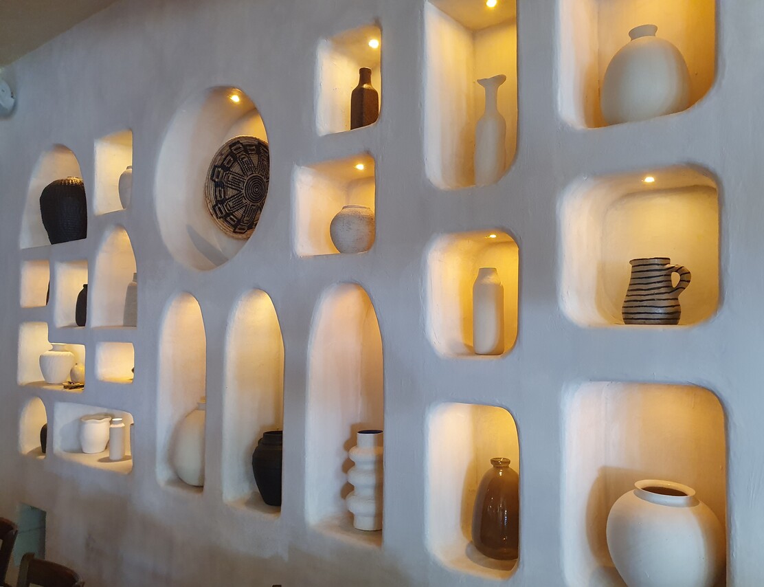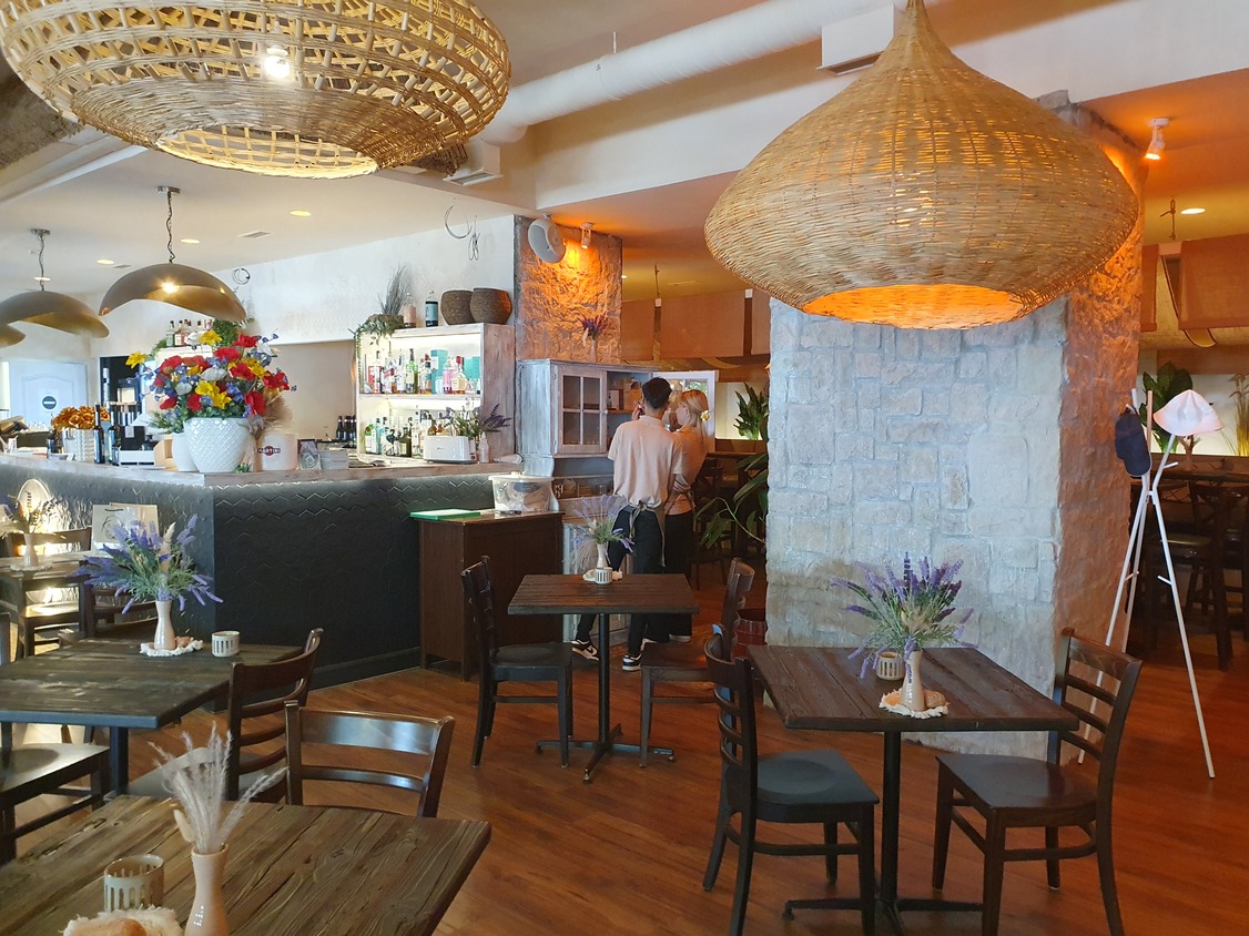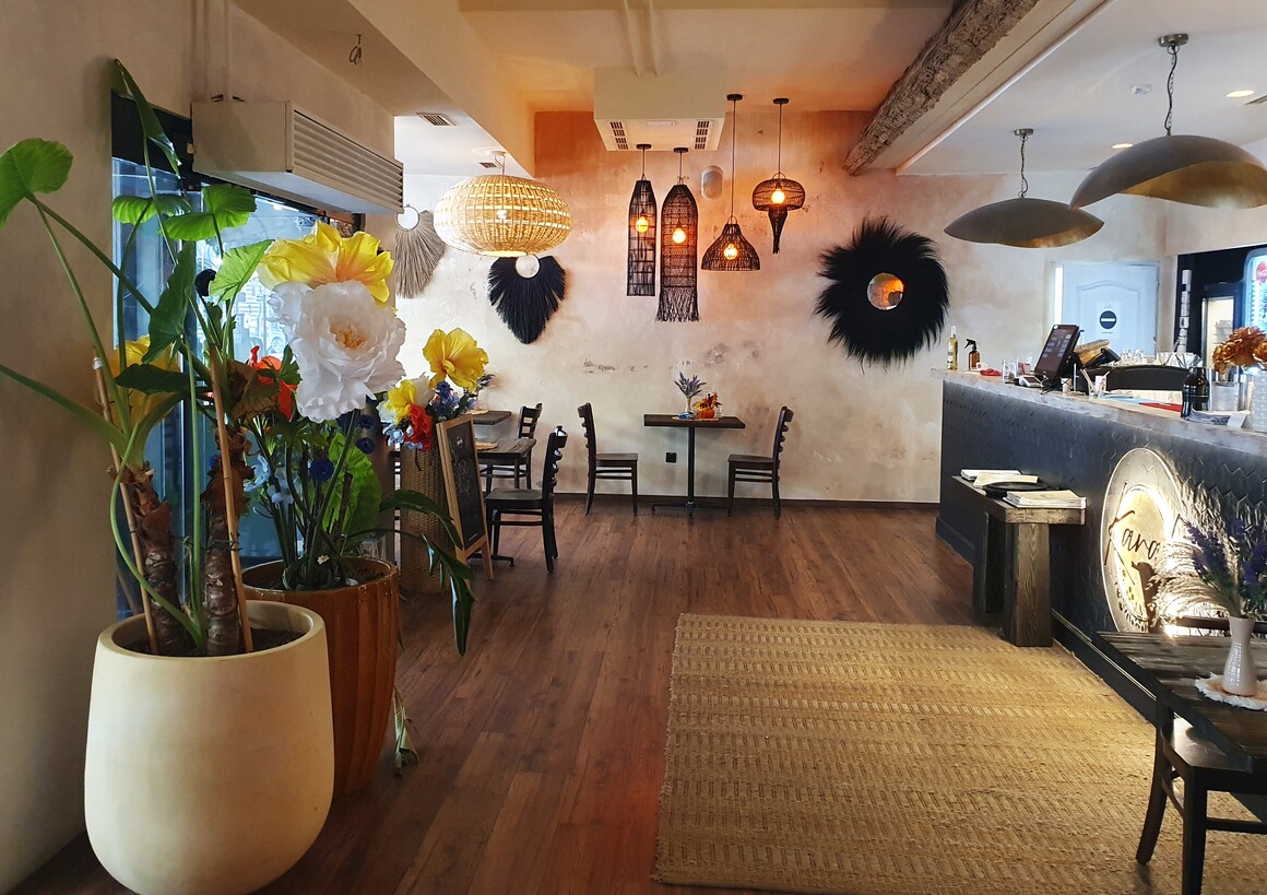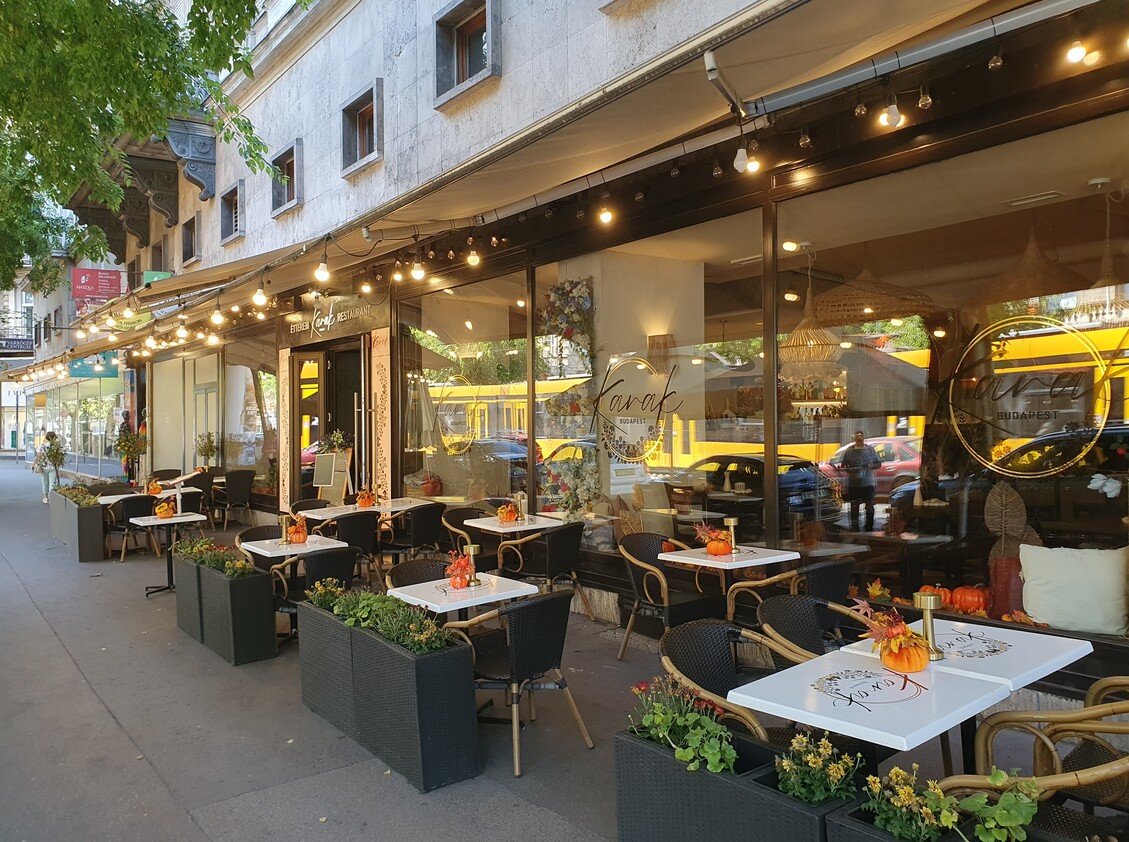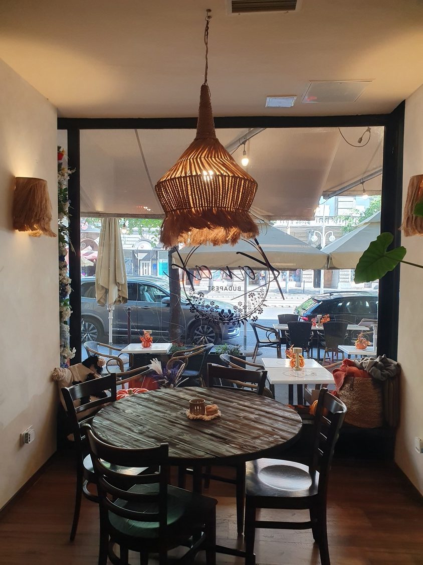 Egyedi hangulatú, lezser eleganciát sugárzó étterem a Nagykörúton. A bejárattól jobbra eső falon hátulról megvilágított mélyedésekben görög stílusú kerámiatárgyak kaptak helyet, a plafonról dizájnos világítótestek lógnak. A fából készült asztalokon száraz virág díszeleg. Nyáron az utcán kialakított teraszt is üzemeltetnek.