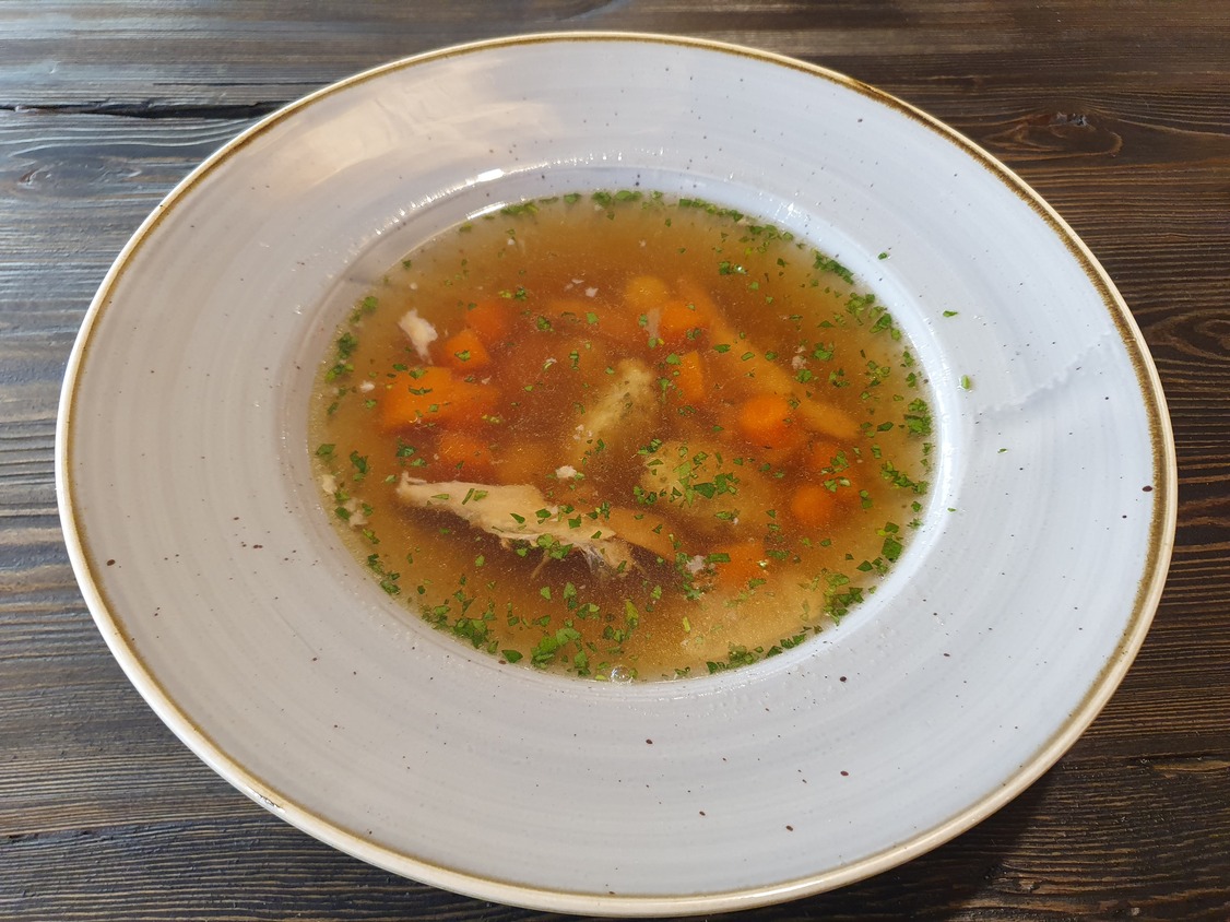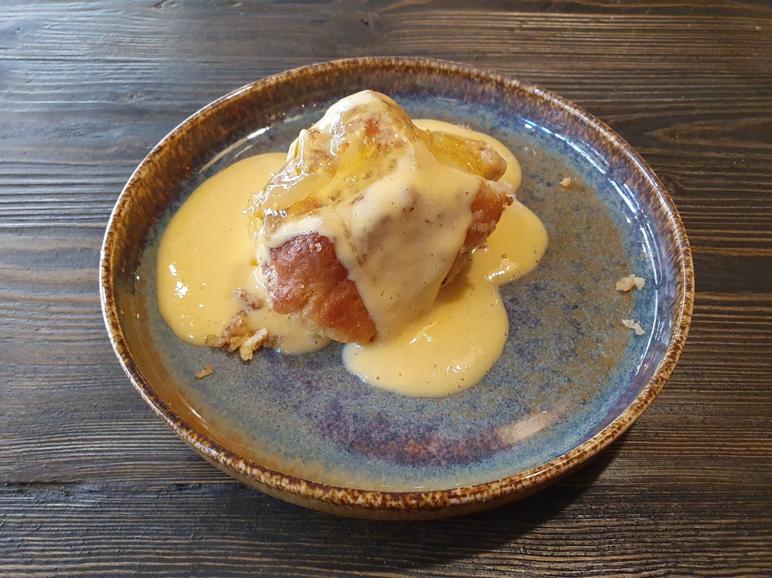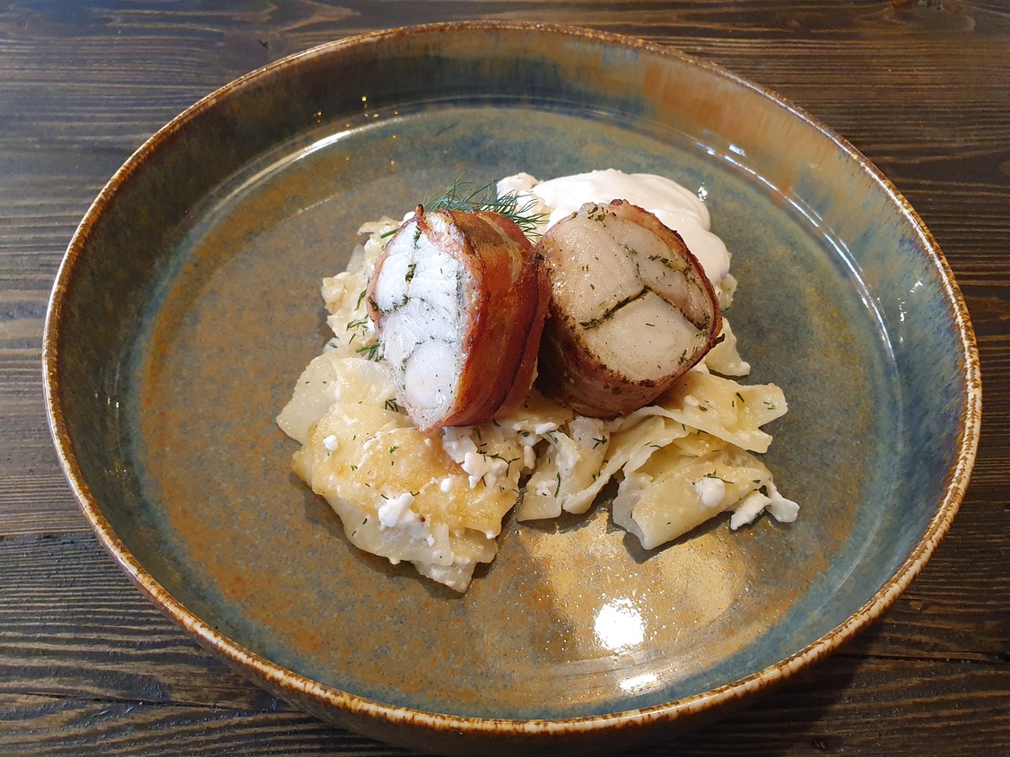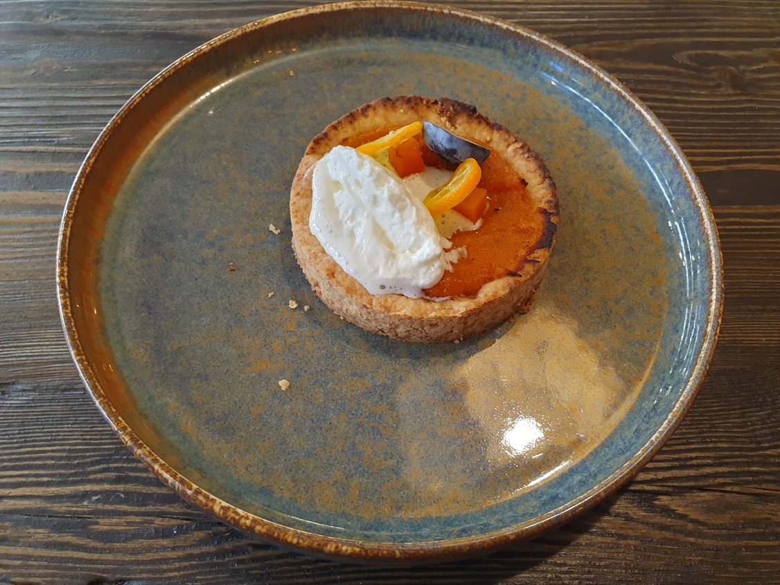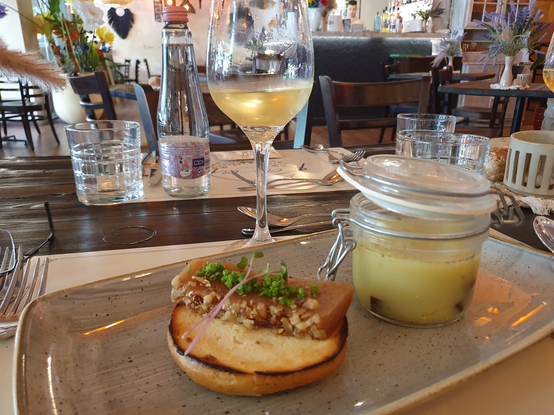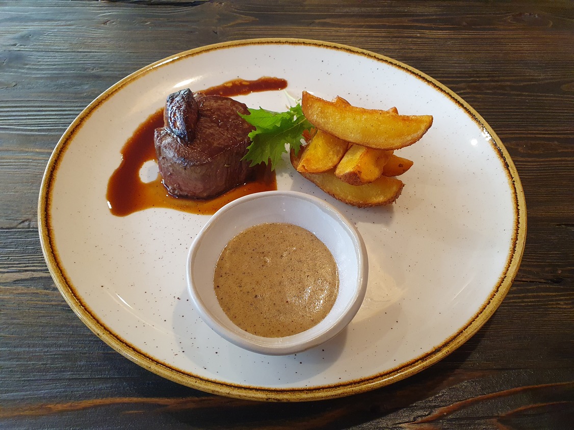Első fogásunk hízott kacsamáj volt zsírjában, mely csatos befőttesüvegben érkezett, a máj remek, szép színű, kíméletesen hőkezelt, jó ízű. Jól sikerült birsalmasajtot és pirított bagelt adtak mellé. Kiváló, harmonikus indítás. Valamivel több bagel is elfogyna mellé, hacsak nem akarjuk a bőven mért zsírt otthagyni. Fácánleves következett zöldséggel és vargányás daragaluskával. A lé gyönyörű, áttetsző, mély ízű, a műfaj büszke képviselője, a zöldségek nem főttek túl, a galuska jó tartású. A bordírozva készült üde, megnyerő állagú, ízletes szürkeharcsát jól sikerült túróscsusza egészítette ki, a pörc funkcióját a halat kalodába záró pirított bacon töltötte be. Egy kifogástalanul megsütött bélszín következett, amit egy kacsamájfalat koronázott s intenzív ízű borsmártás, valamint házi steakburgonya kísért. A desszertek sem okoztak csalódást. Először finom aranygaluskát kaptunk ízletes, selymes mártással. A galuskát egy leheletnyit lehetne könnyíteni, de így is kifejezetten megnyert, akárcsak a marinált sütőtökkel és sajthabbal tálalt sütőtökös tarte.