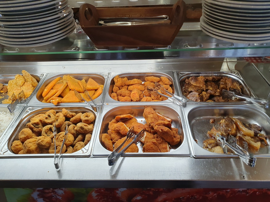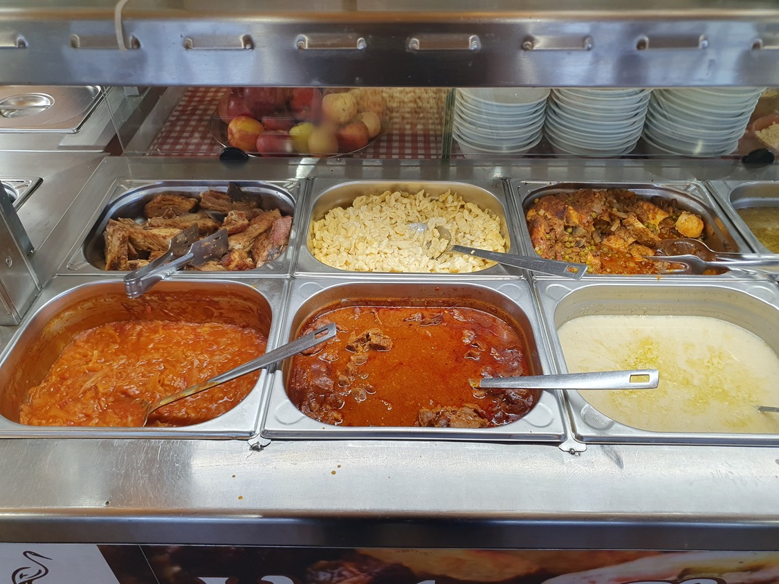 A gulyáslevesnél ettem már jobbat, a zúzaleves élvezhető, a zöldség benne mondhatni értelemszerűen túlfőtt. A zúzapörkölt korrekt, a hús kellemesen puha, íze is megnyerő, akárcsak a szafté, mely egyébként lehetne sűrűbb. Ez így alapjáraton nagyon rendben van, különösen, ha hozzávesszük azt is, hogy a galuska kifogástalan ízre, állagra egyaránt. A rántott pangasius, sajt és gomba hozzák azt, amit hozhatnak, a párolt káposzta rendben van, a párolt mirelit zöldség gyengécske, akárcsak a kenyér. Az oldalas és sült tarja korrekt, a desszertfront nem erős, egyféle süti van, mely nem meggyőző.
