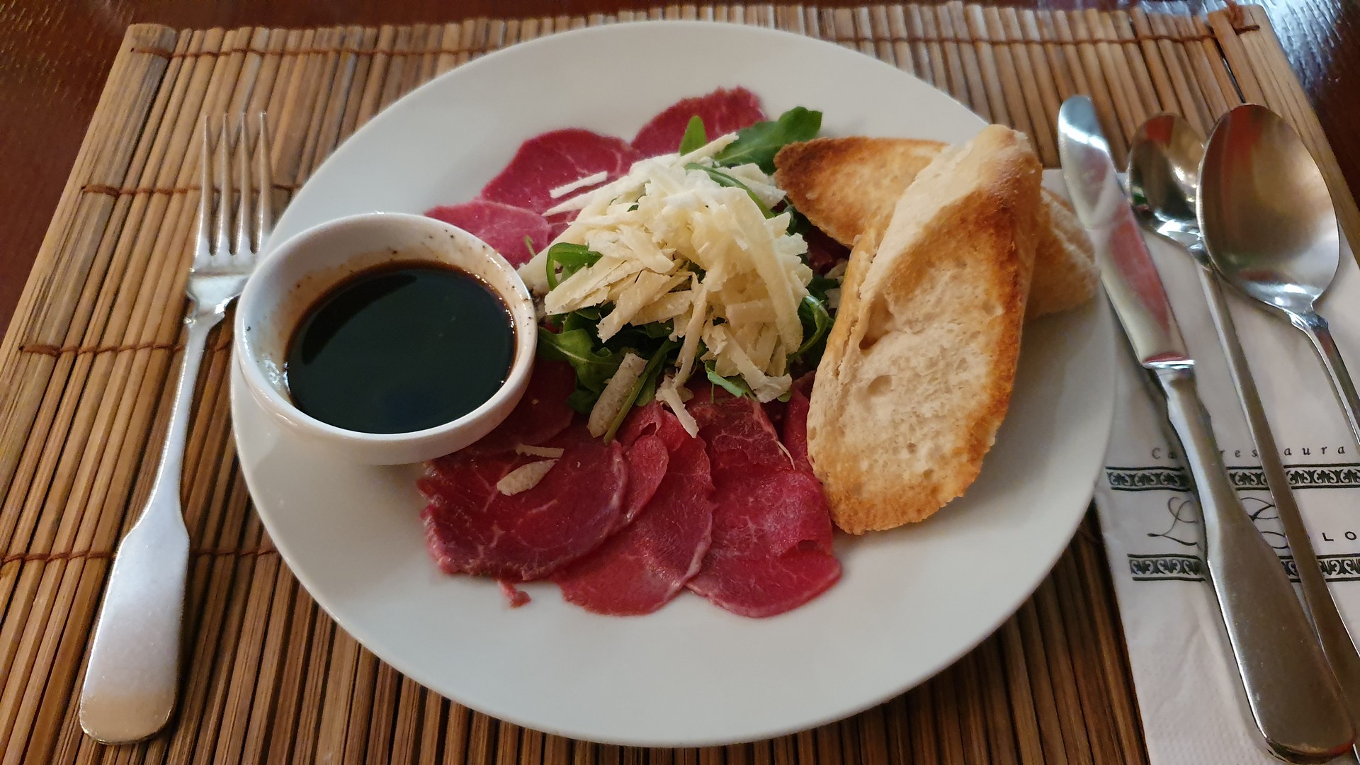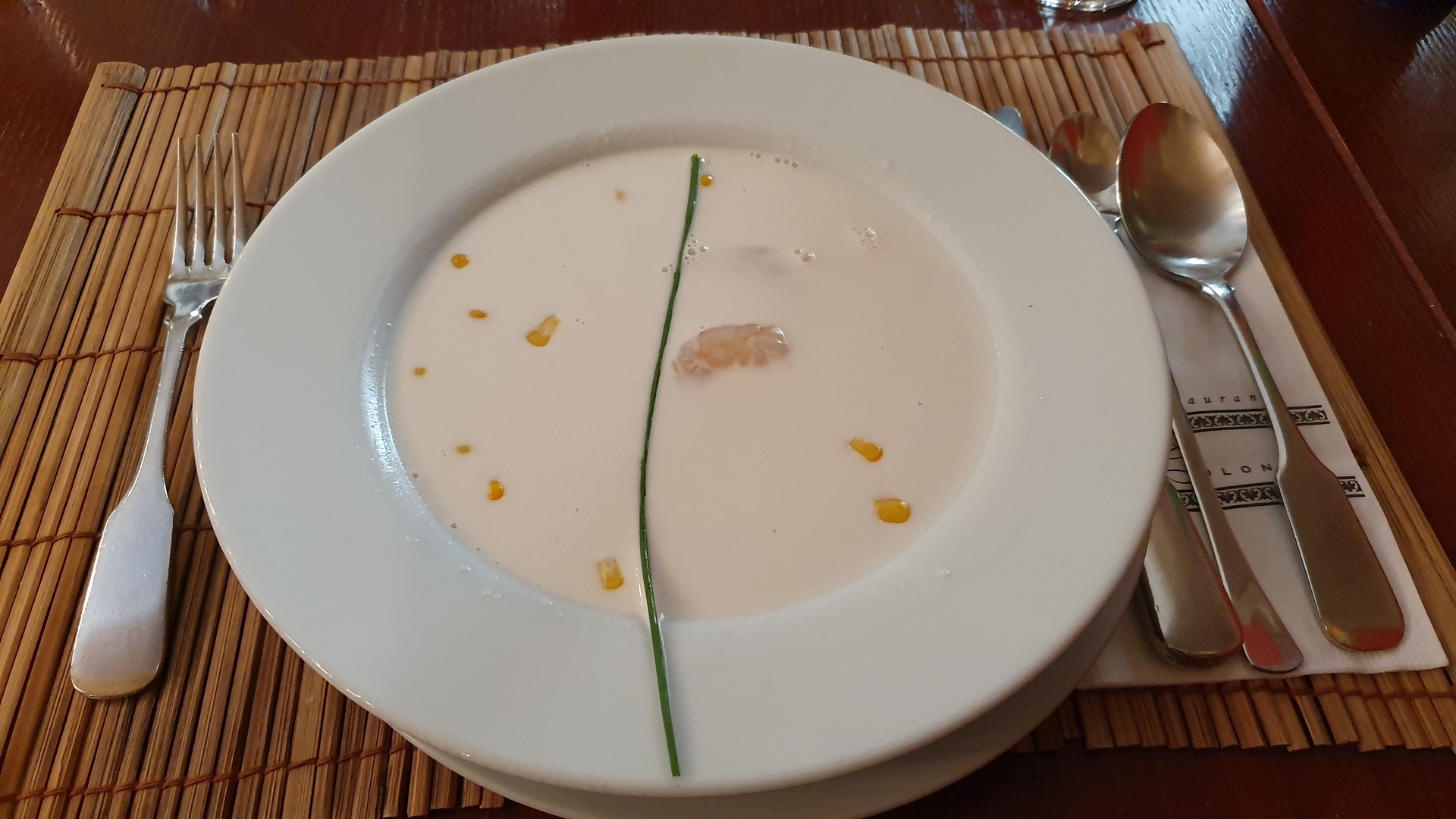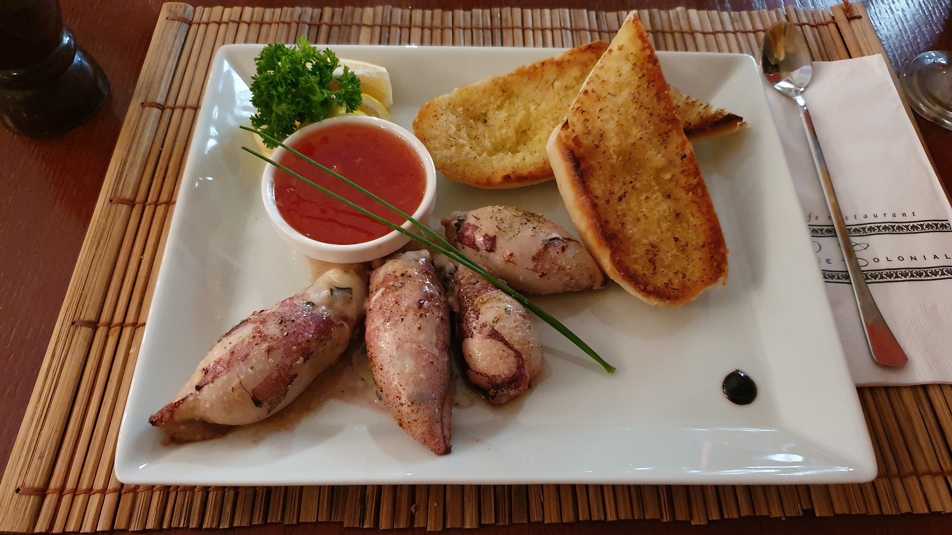 Rendeltünk kókusztejes ráklevest, ami kissé kötelességszerű volt, íze lehetett volna intenzívebb. A rák ízre és állagra megfelelt várakozásainknak. Kis zöld koriander sokat dobott volna rajta. Korrekt, élvezetes volt a rukkolával, nagy lyukú reszelővel adagolt parmezánnal, kis tégelyben felszolgált átlagos balzsamecettel és hasonló szintű pirított bagettel kínált bélszín-carpaccio. A töltött tintahallal hasonló minőséget képviselt: a hal jó, friss, nem gumis, a töltelék lehetne izgalmasabb, a mellé adott édes-csípős szósz késztermék, a fokhagymás bagett korrekt-átlagos. A mangós mascarponekrém élvezhető volt, de többet vártunk tőle, nem hozta a friss mangó kicsattanó üdeségét.