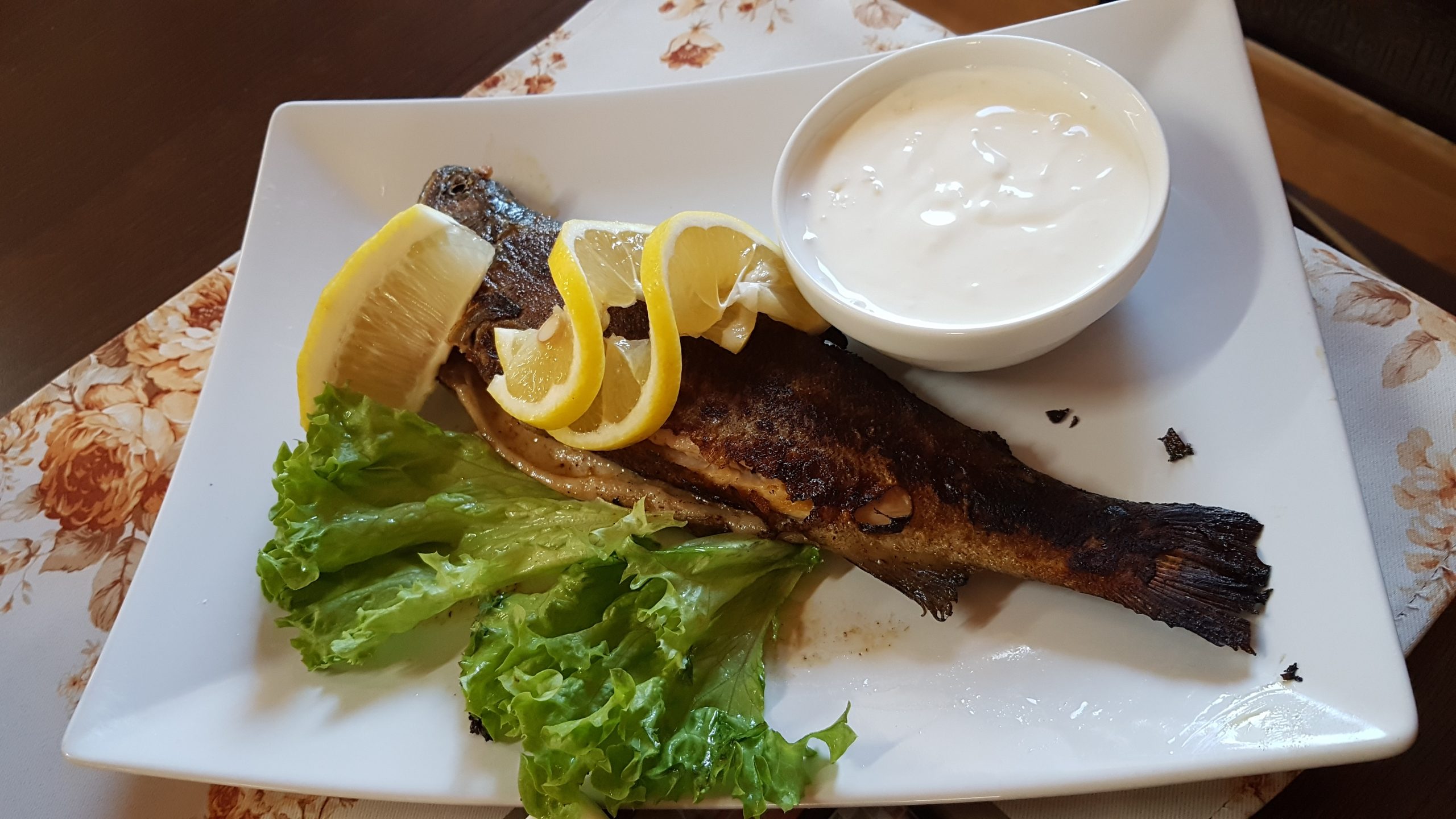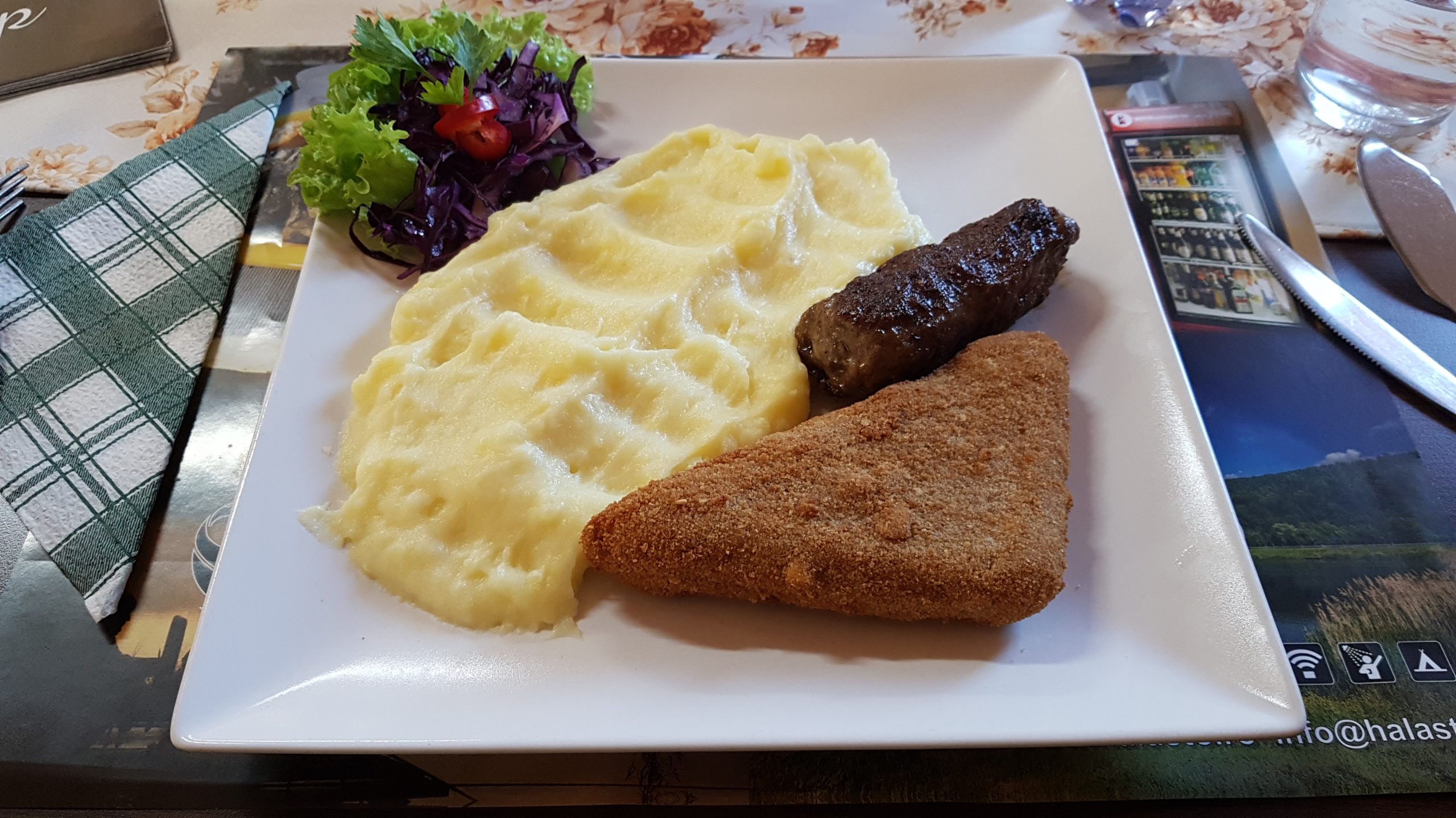 A kértem rántott sajtot egy miccsel és krumplipürével. A sajtot brutális vastagon borította be a panír, de tény, hogy tartalma nem folyt ki sütéskor, a miccs korrekt, szaftos volt, serpenyőben készült, a házias krumplipüré jól sikerült, nem spóroltak ki belőle semmit. Kértem egy pontypatkót, annál is inkább, hogy a hely Facebook oldalán szép pontyokkal fotózkodnak a horgászok, de azzal éppen nem tudtak szolgálni, így a régióban hagyományos hal, a pisztráng mellett maradtam. Egyet rendeltem, kettőt hoztak, de a tukmálási kísérlet kudarcot vallott, annál is inkább, hogy az eddig felsoroltak is bőven kitettek egy ebédet. A friss halat lisztbe forgatták, majd bő zsiradékban sütötték ki. Fokhagymás tejfelt kértem mellé és vegyes salátát. Utóbbi szép, piros-fehér-zöld volt, az uborka és paradicsom dresszing nélkül érkezett, a káposztasalátával meg voltam elégedve.