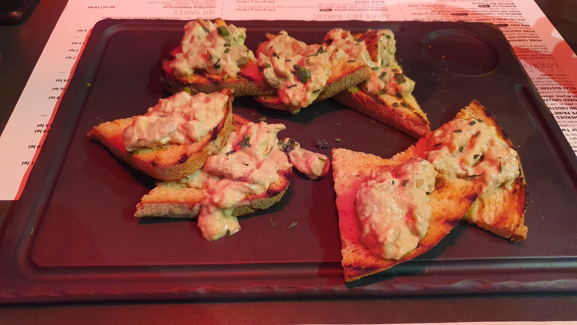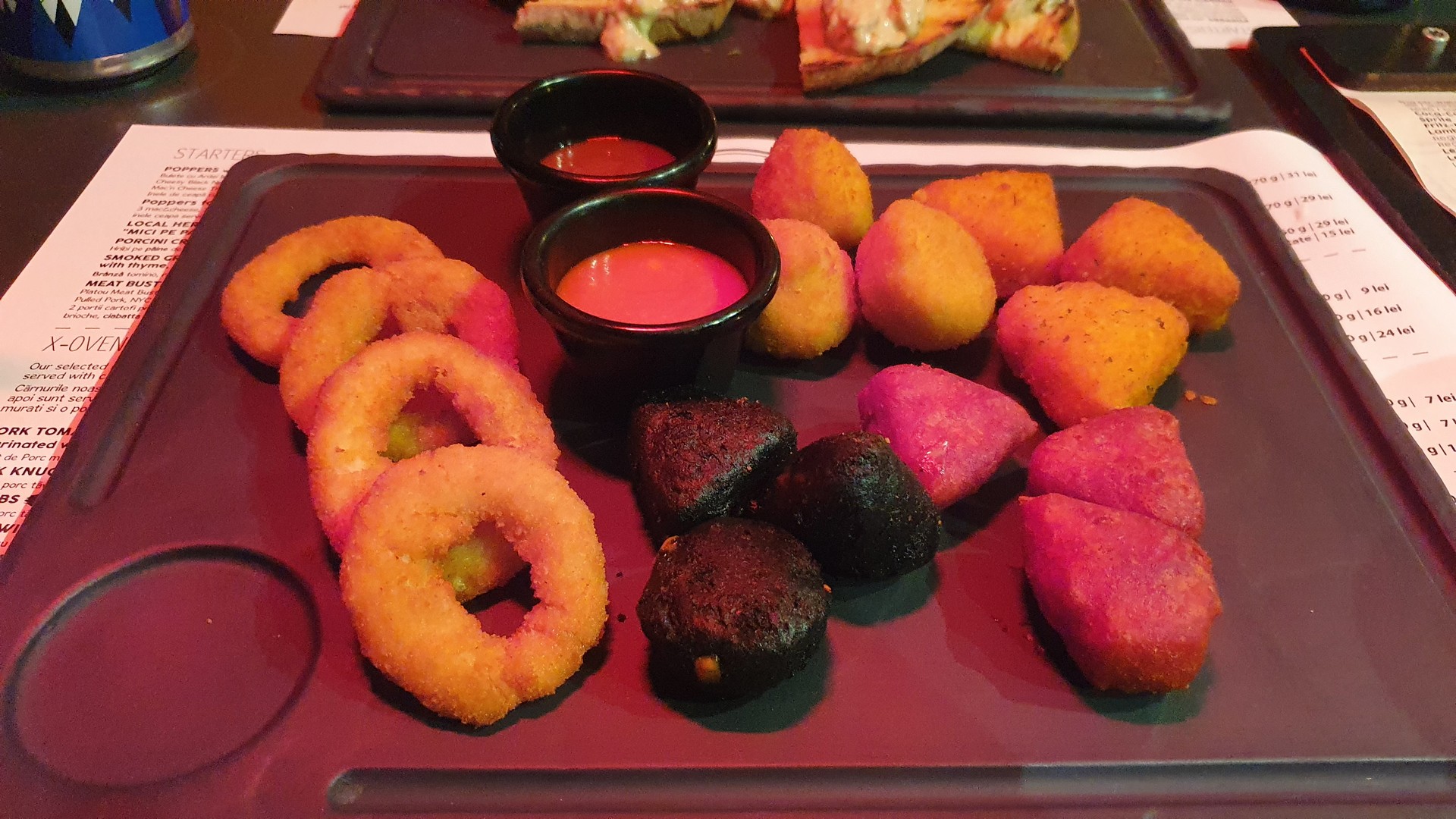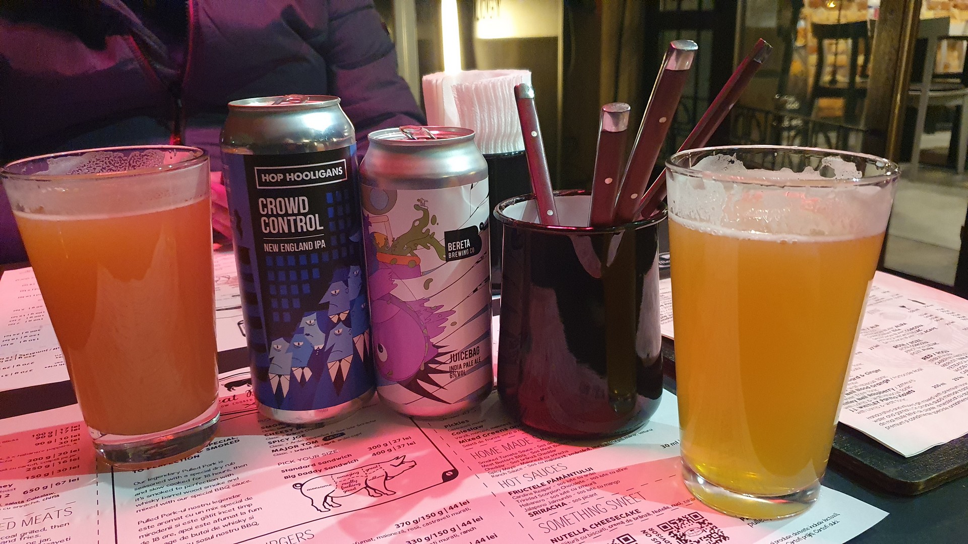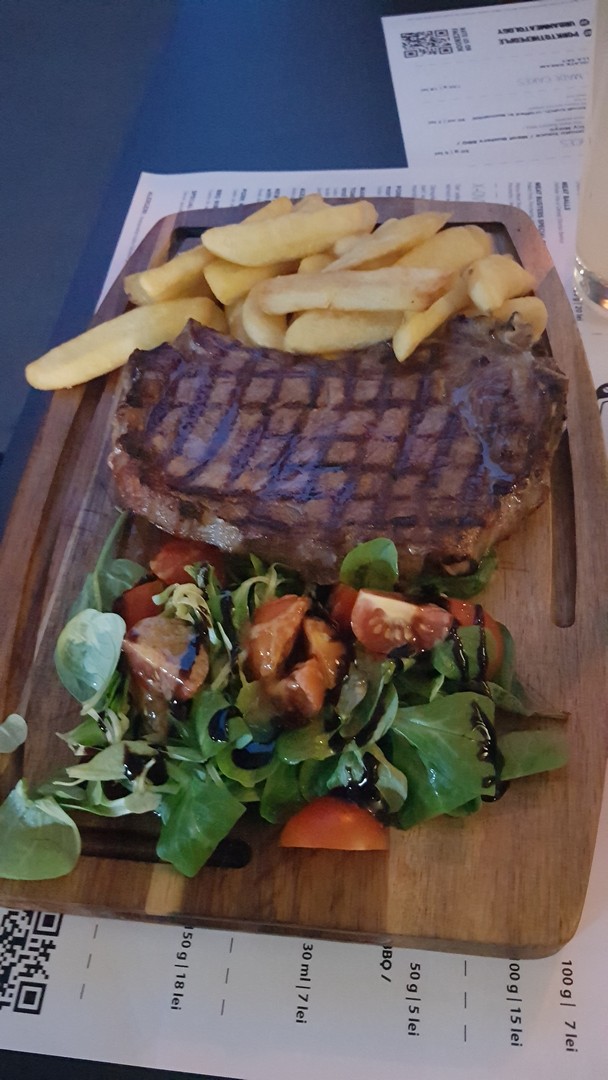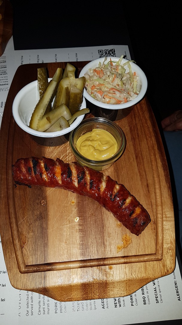 Első alkalommal édesköményes vörösboros kolbászt és a rib eye steaket rendeltünk, remek volt mindkettő, bár a steak az általunk kért raw fokozaton kissé túlment. Ételeinket szépen tálalták, vágódeszkán, a steaket jobbféle mirelit krumplival, koktélparadicsomos madársalátával, a kolbászt coleslaw salátával, mustárral és savanyú uborkával. Másodszor sörkorcsolyának kértünk egy Poppers-vegyes tálat, ami minőségi mirelit snackeket takart, főként bundázott chilis sajtokat, rántott hagymakarikával és kétféle készterméknek tűnő mártással, valamint vargányakrémes pirítóst, ami kifejezetten jól sikerült.