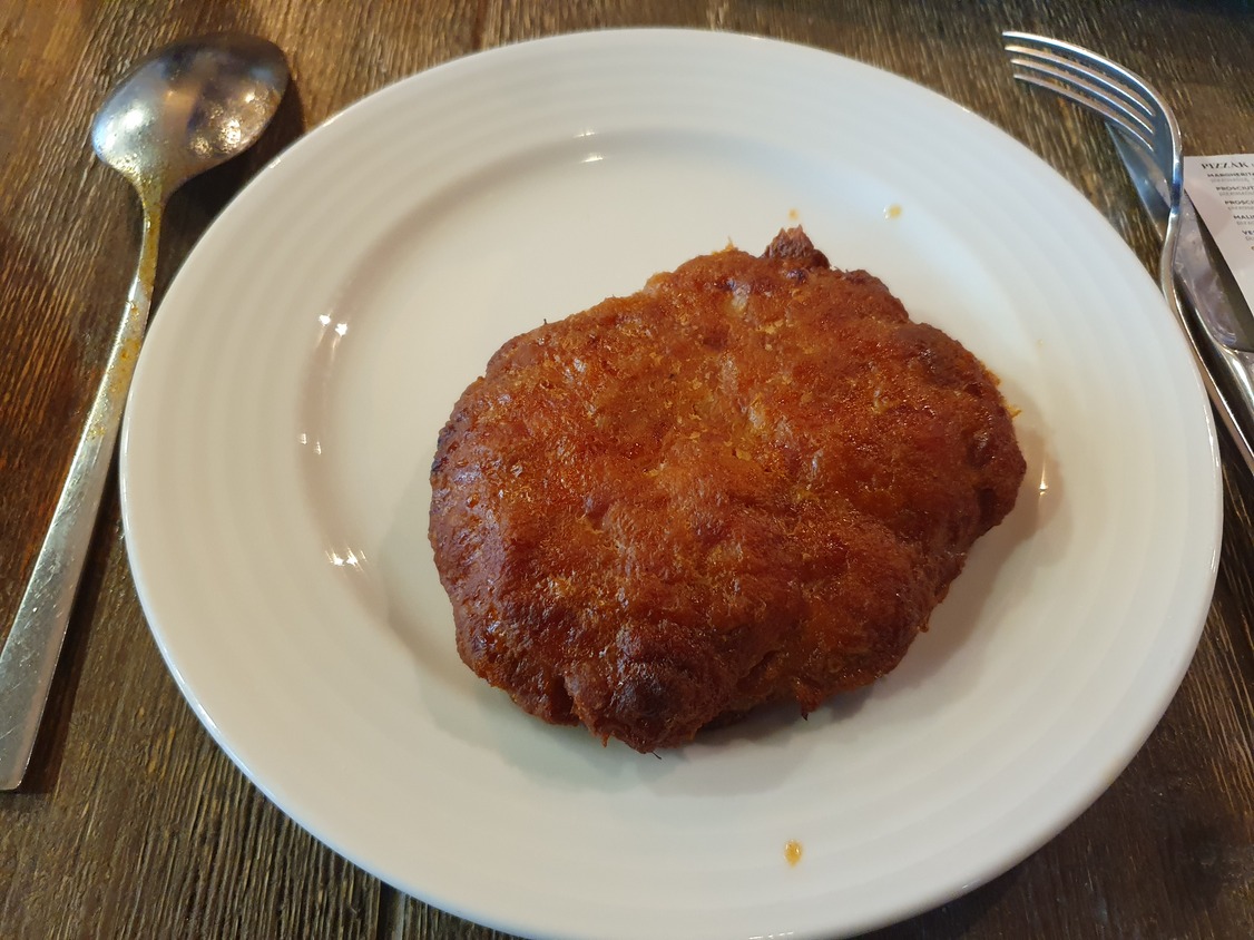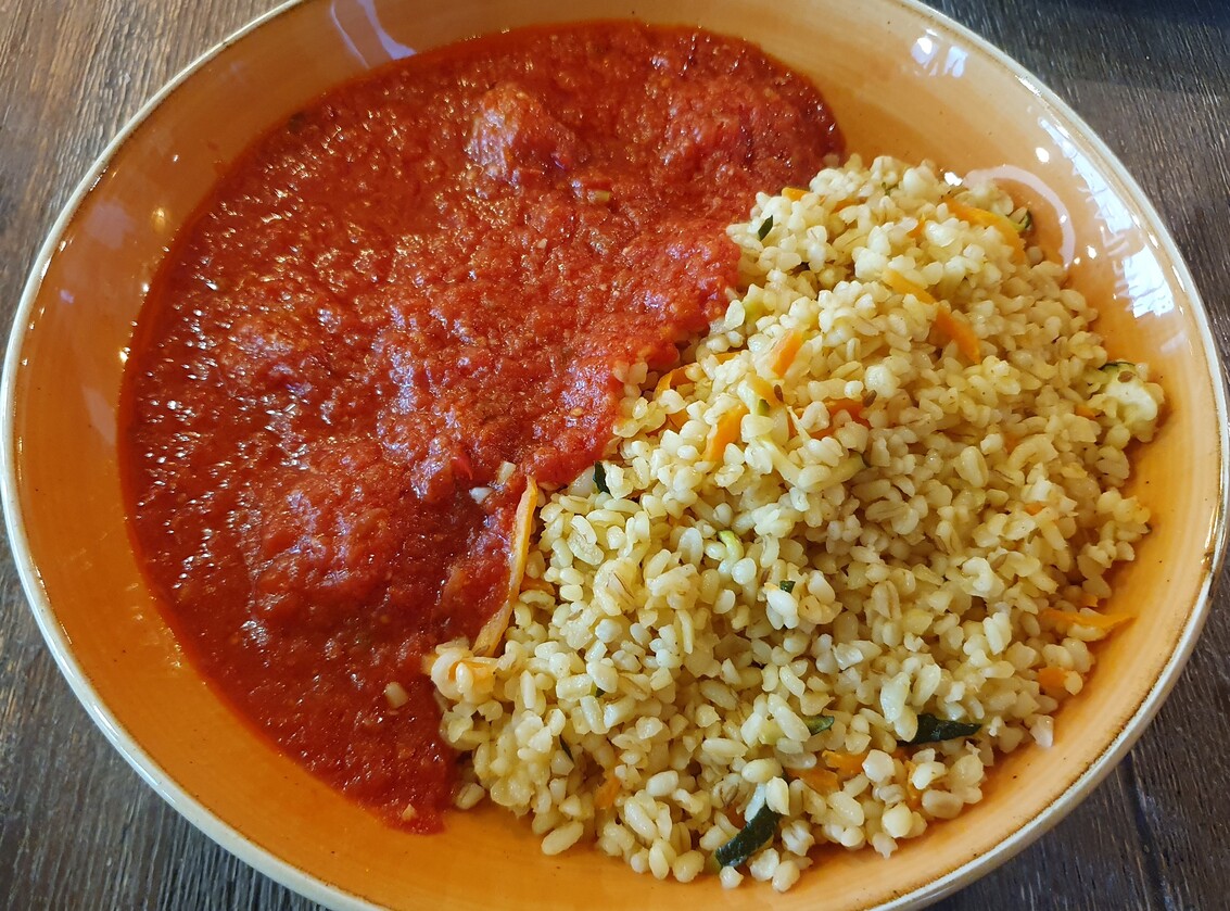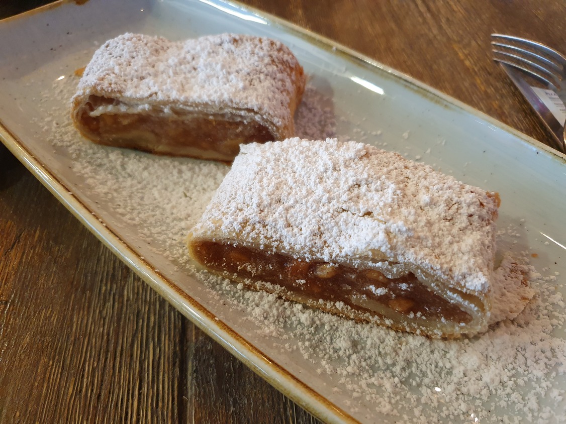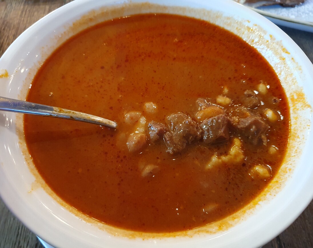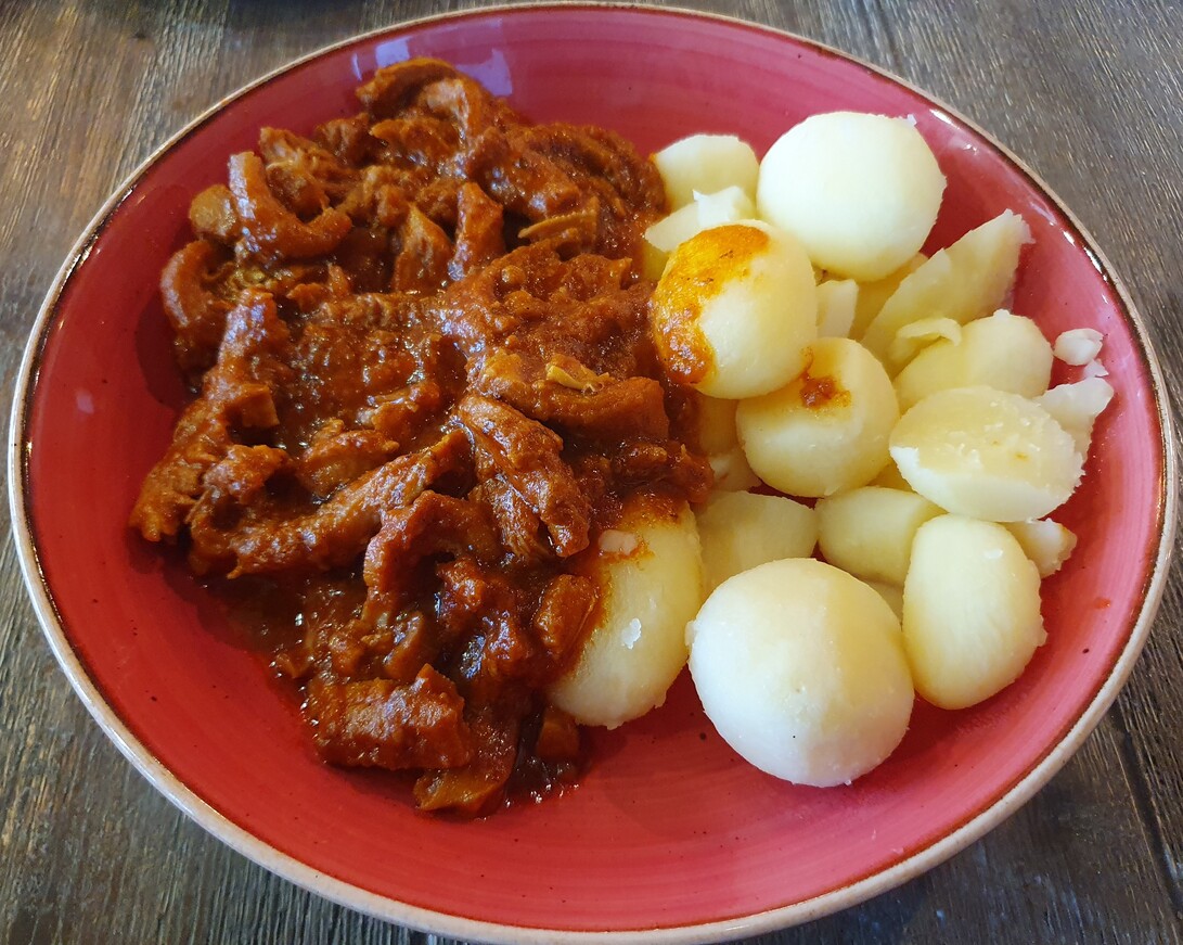A babgulyás hatalmas adag, ízletes, lehetne benne kevesebb csipetke és több bab, hőmérséklete is lehetne magasabb, de így ahogy van a jobbak közé tartozik. A pacalpörkölt kifejezetten jól sikerült, íze megnyerő, színre is szép, a pacalnak van tartása, még harapható, de már nem rágós, a szaft kellően sűrű, többet is elfogadnánk belőle. A kovászos uborka állaga kifogástalan, ízre is tetszetős, bár egy cseppet félrement az erjedés. Az éppen, hogy langyos főtt parázsburgonya átlagos, a kenyér lehetne jobb minőségű. Rendeltem kíváncsiságból egy fasírtot is, mely állagra túl tömör, ízre fád, jobbakhoz szoktunk. Jól sikerült viszont az ügyesen fűszerezett mártásban felszolgált, bulgurral körített citromos marokkói húsgombóc. Mint megtudtuk, az almás rétest nem ők készítik, viszont finom, kellemesen savas, nincs benne felesleges állagjavító.