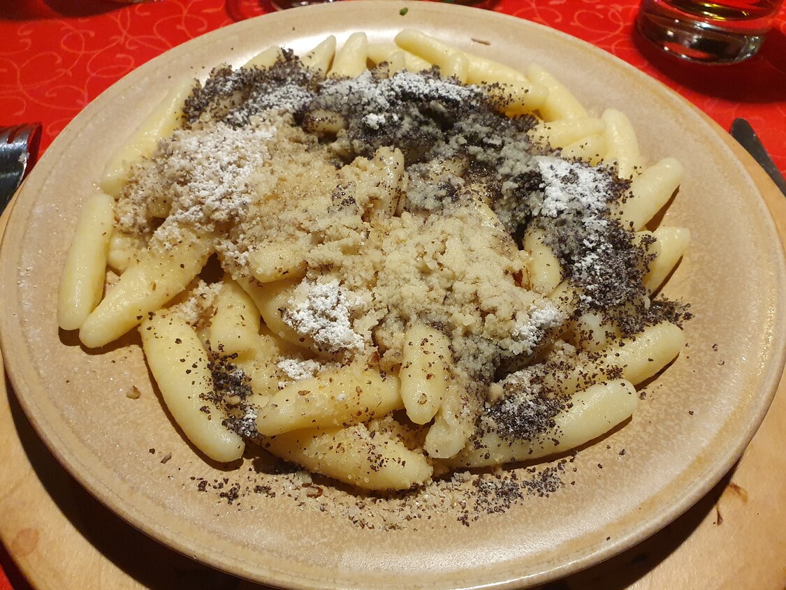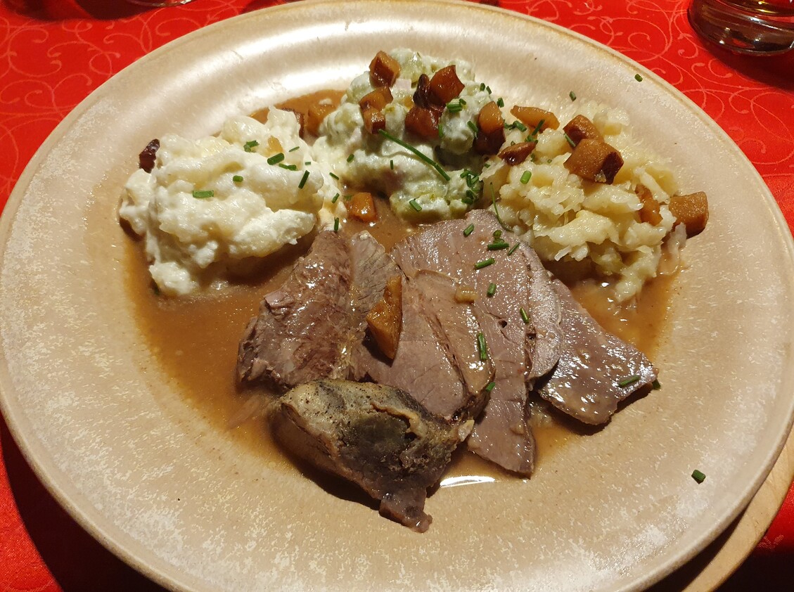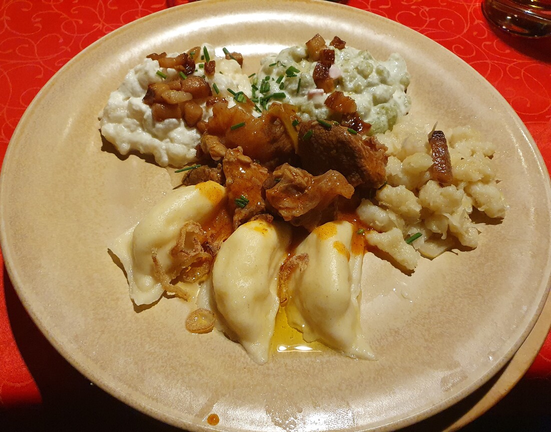 A borscs leves ízletes, színe lehetne élénkebb. A mellé adott ipari kenyér friss, fél fokkal jobb az átlagnál. A bárány élvezhető, de leginkább kötelességszerűnek mondanám, lehetne szaftosabb, ízesebb. A mellé adott sztrapacska-válogatás (nevezzük így, a Belső-Magyarországon elterjedt nevén a „halusky”-t) kifejezetten jól sikerült. Az étlapon a külföldi gyakorlatnak megfelelően gulas-ként szereplő marhapörkölt nem kiugró, kissé mócsingos, de elfogy. Nem nagy adag, de a jól sikerült körettel, az előbb említett sztrapacskaválogatással és a juhtúrós, sült hagymás piroggal együtt jóllakásra alkalmas. A főételek zömének ára 10 euró körül mozog, ami kifejezetten barátinak mondható. A vajjal bőségesen meglocsolt diós-mákos nudli kifogástalan, ízre-állagra egyaránt.