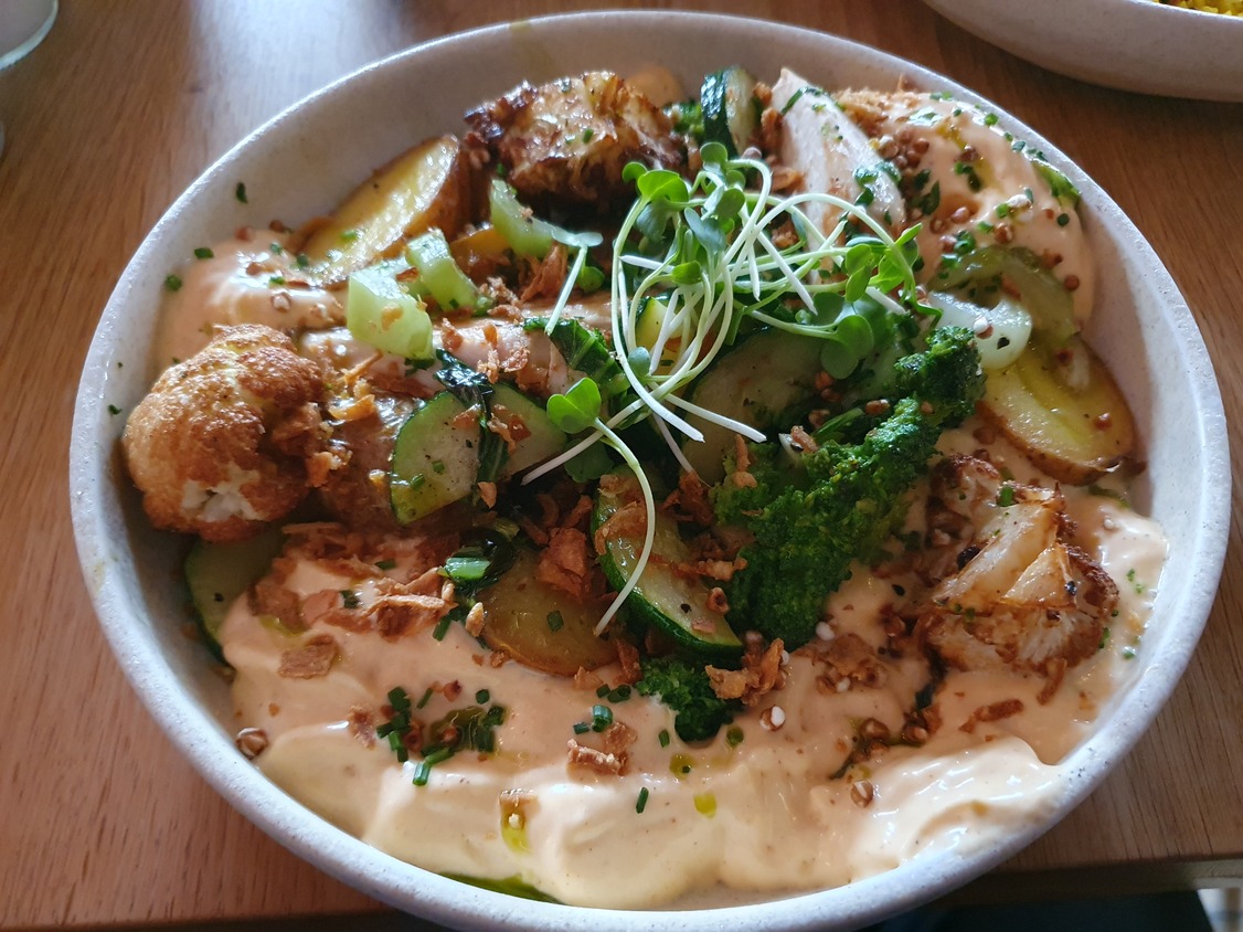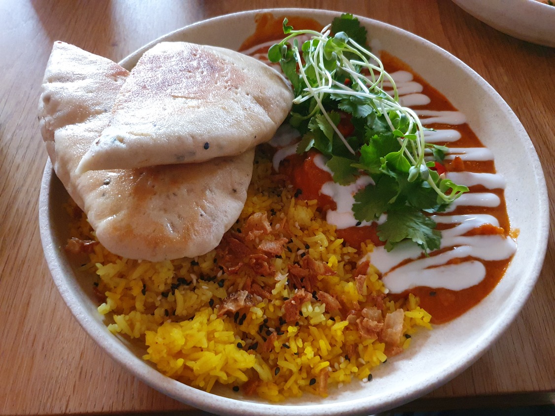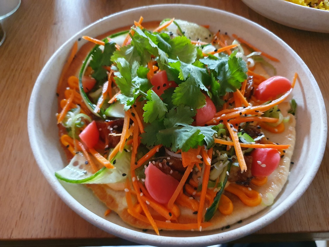 A cheddar sajtos karfiol remek, tálalásra, ízre, állagjátékokra egyaránt. Kreatív, izgalmas, egyedi kompozíció. A butter chicken savra hangolt, többfelé is ettünk meggyőzőbbet, ugyanez igaz a naan kenyérre, amit lehet még gyakorolni. Tény ugyanakkor, hogy a fogás nem élvezhetetlen, de elmarad az autentikus indiai éttermek tucatjai által keltett várakozásoktól. A bao-t nyitva tálalják, nagyon jók az ízek, könnyed maga a bao, jók a rávalók, ez a fogás egy meggyőző, jól sikerült átirata a világot meghódító kínai szendvicsnek. Érétkeltük, hogy nem spóroltak a zöld korianderrel. (Teszt időpontja: 2025. december 31.)