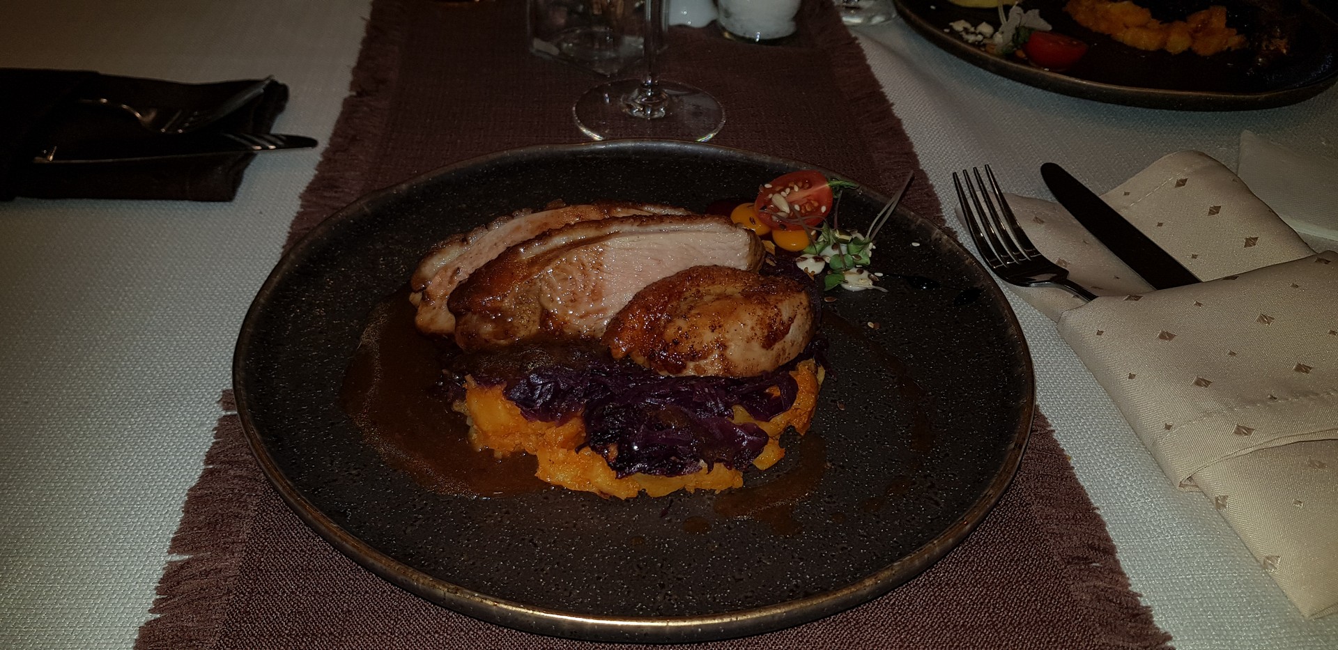 Első látogatásom alkalmával, 2018 decemberében megtetszett a „Vakrandi a szakáccsal” elnevezésű étel, mely háromféle húst ígért különböző köretekkel. Kaptam ízletes, hagyományosan elkészített kacsacombot jóízű párolt káposztával, gratinírozott sertéskarajt krumplipürével, valamint csirkemellet ropogós bundában salátaágyon. Kifejezetten tetszett a míves, klasszikus és modern elemeket egyaránt alkalmazó dekoráció. Másodszor 2021 januárjában ettünk remekült hőkezelt kacsamellet roséra sütve, házias, párolt lilakáposztával és paprikás krumplival, kiváló oldalast (helyi megnevezés szerint sertésbordát) BBQ stílusban, mint az étlap is írja, „hosszan füstölve, omlósra készítve”, steak burgonyával, valamint korrekt, izgalommentes túrófánkot áfonyalekvárral és tejfellel, amit érthetetlen módon és teljesen feleslegesen porcukorral is megszórtak.