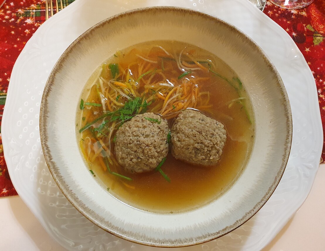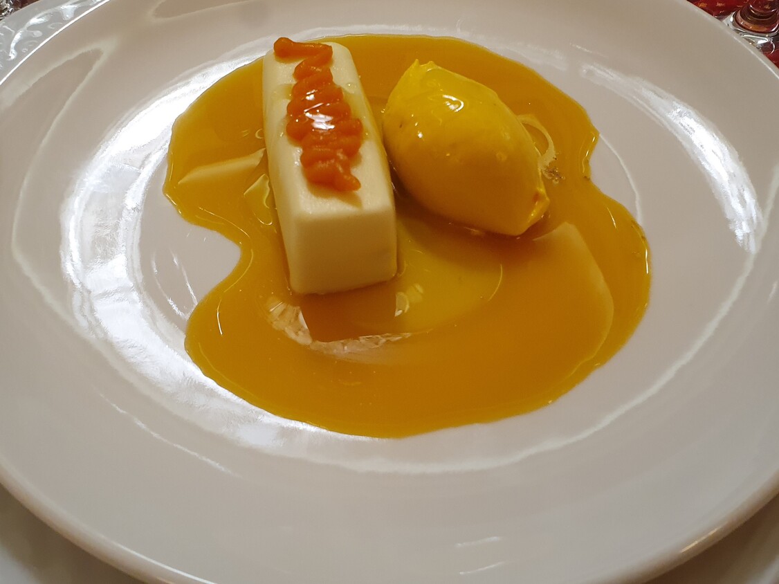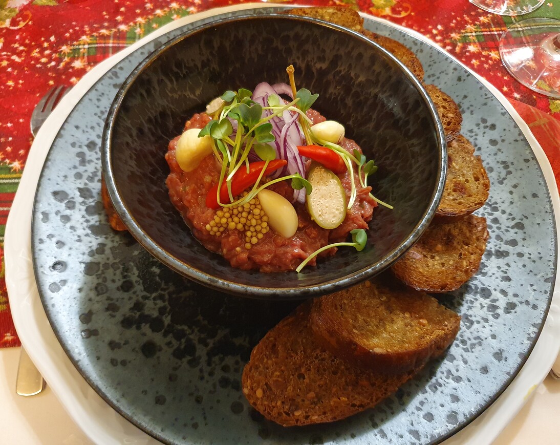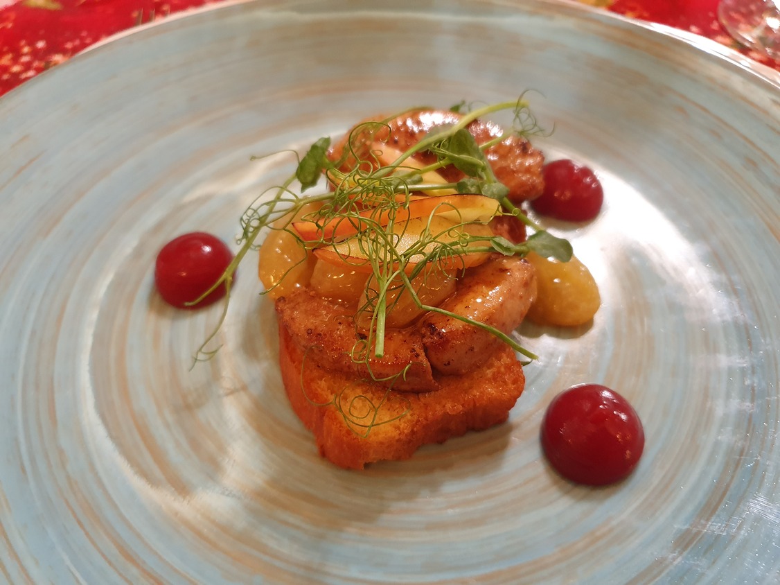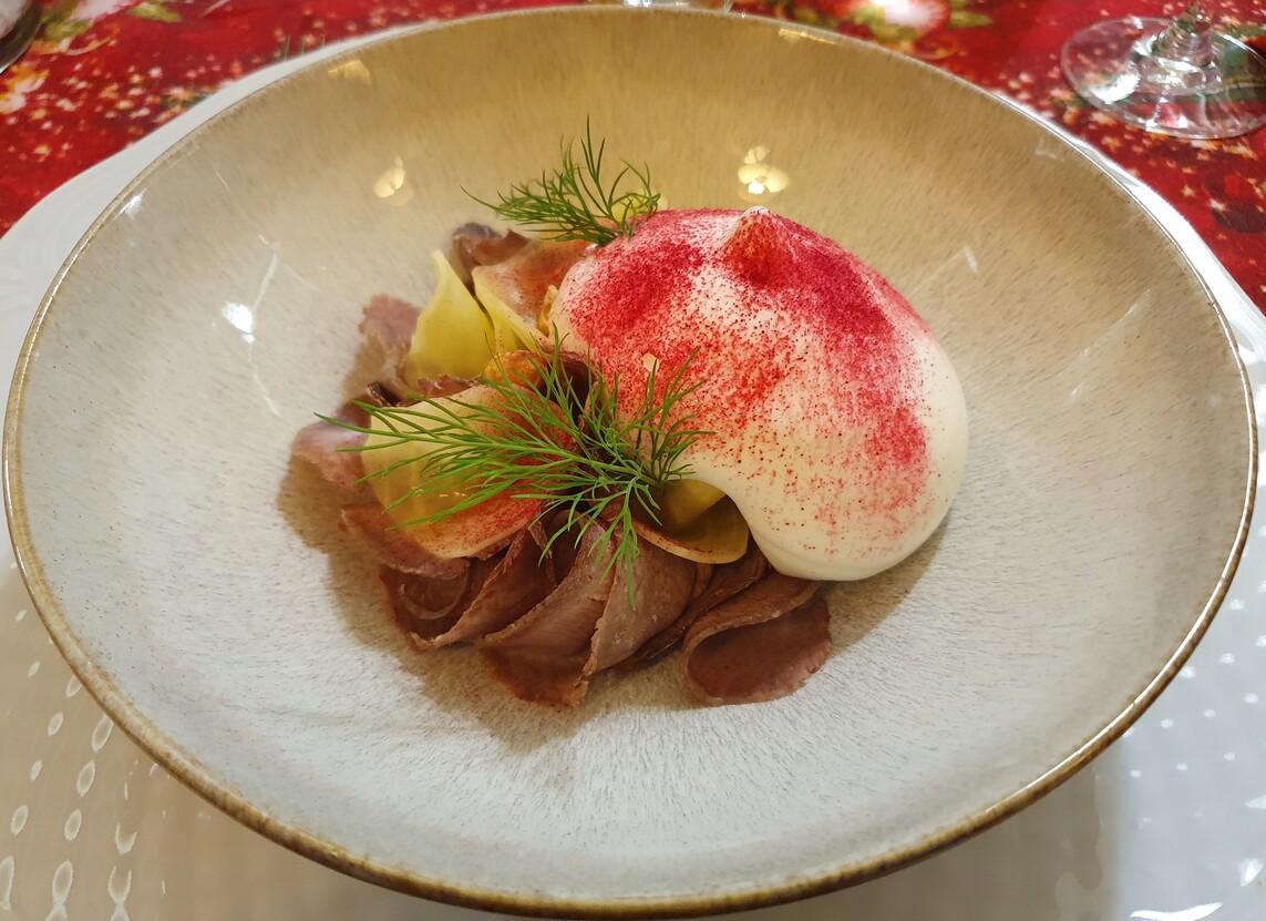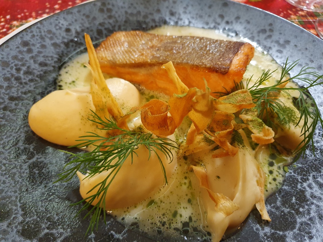 A májgombócleves szép színű, kifejező ízű, harmonikus, a gombóc jó tartású, szépen formázott, ízre is remek. Üdítik a levest az apróra vágott petrezselymen kívül a roppanósságukat megőrző vékony gyökérzöldségcsíkok. Koncentrált, jó ízű a sütőtökkrémleves is, amit sushigyömbérrel, egy kevés zöld korianderrel és pirított tökmaggal dobtak fel. A tatárbifsztek ízre nem rossz, de nem ér fel az étterem színvonalához, nem vagdosták, hanem darálták, pépesre, ami nagy kár. Jóféle, zsiradékban pirított magos kenyeret adnak mellé. A tálalás megnyerő: mikrozöldek, lilahagyma, mustármagkaviár, savanyú chili, egész fokhagymagerezdek. Utóbbinak a Felvidéken megvan a kultúrája, Belső-Magyarországon nem jellemző, hogy fokhagymát adjanak a tatárhoz azért, hogy a vendég bekenje vele a pirítóst. A hirtelen sült libamáj tartása lehetne határozottabb, de hála a jó alapanyagnak, ízre rendben van, a mellé adott esztétikusan tálalt gyümölcsgél nem meggyőző. Pazarul sikerült viszont a vékonyra szelt füstölt marhanyelv, ami mellé leheletkönnyű juhtúróhabot, céklát, aszalt szilvát és mogyorót adtak. A sütőben hőkezelt lazac szárazabb az optimálisnál, de nem élvezhetetlen, a mellé adott füstölt petrezselyemgyökérpüré ízletes, akárcsak a tárkonyos vermutmártás. A citrusmártásos, helyben készült, selymes, ízre is csodás fagylalttal kiegészített töltött fehércsokis desszertkompozíció egy költemény, megállná a helyét a felső szegmensben bárhol a világon. Jól sikerült a hely nevét viselő karamellás gyümölcsös palacsinta is. „Minden jó, ha vége jó” – tartja a mondás, ami persze általánosságban túlzás, de ezúttal igaznak éreztük, a desszertek feledtették az apró hibákat.