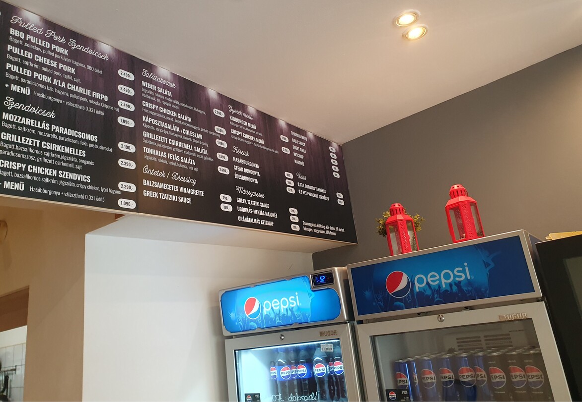 Klasszikus street food éteket kínálnak könnyen hozzáférhető alapanyagokból. Így többek között tucatnyi burger-variációt, tíz marhahúsosat, egy csirkéset s egy camembert-eset, quessadilla-t, gyrost, ötféle salátát és hatféle szendvicset, köztük tépett sertéshúsosat, mozzarellásat, paradicsomosat és grillezett csirkemelleset.