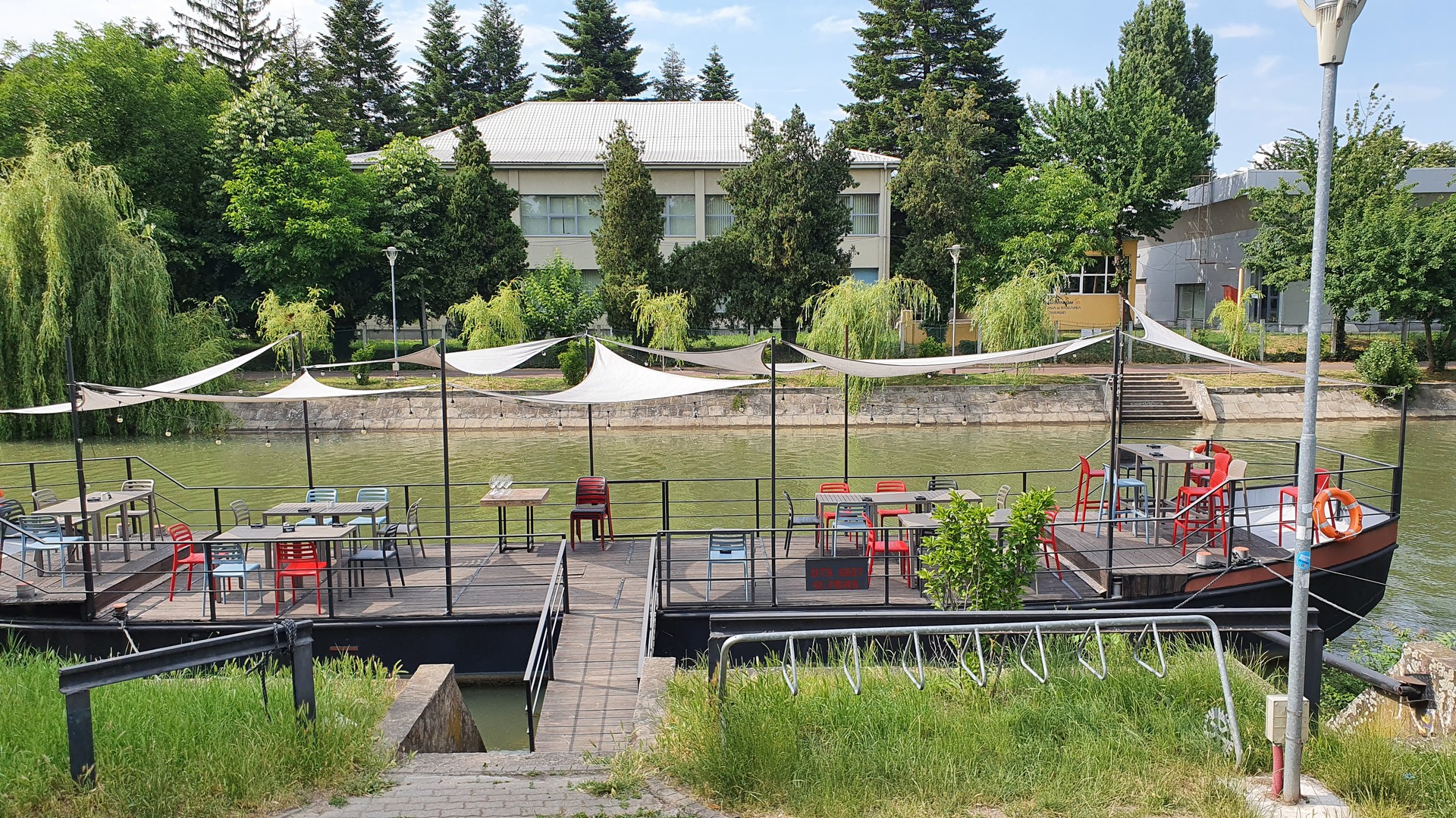 Nagy befogadóképességű, népszerű és trendi vendéglátóipari komplexum a város átszelő Béga folyó mentén, közel a „diákvároshoz”, mely a beltér mellett a tetőteraszon, a földszinti teraszon, valamint az épület melletti uszályon is várja a betérőket. A beltér hangulatos lezser, kialakításából és dekorációjából ítélve koncerthelyszínként is funkcionál. Ügyelnek a dizájnelemek harmóniájára, melyeknek részét képezik a tálalóeszközök is. Az előételt egy szögletes tányérra helyezett tálaló-bárdon kapjuk, a főételeket faalapzattal ellátott kisméretű, ovális öntött vasserpenyőben.
