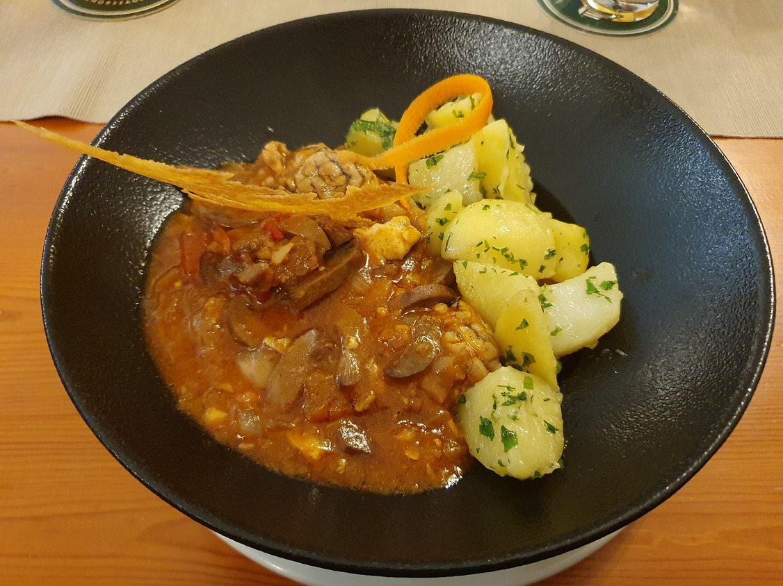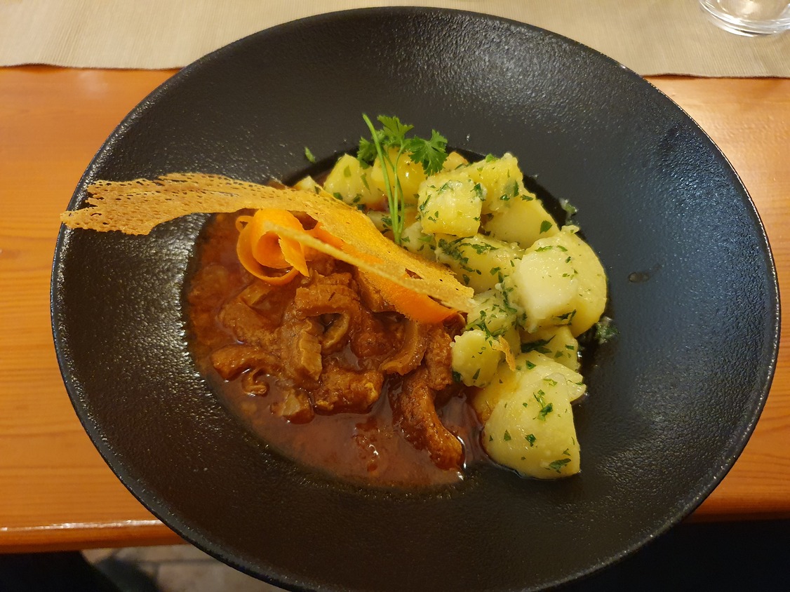 A pacalpörkölt ízre jó, állagra megnyerő, színe lehetne pirosabb, csíkozása szélesebb. Jól sikerült petrezselymes krumplival tálalják tuille-dísszel. Hasonló a vese-velő, a velő nincs szétkenve, ízre, állagra megnyerő mind a vese, mind a velő. A dísz és köret ugyanaz. A túrógombóc helyben készült, lehetne kicsivel remegősebb, túrósabb, de alapvetően korrekt produkció ez is, a meggy és a mák beemelése az ízképbe jó ötlet.